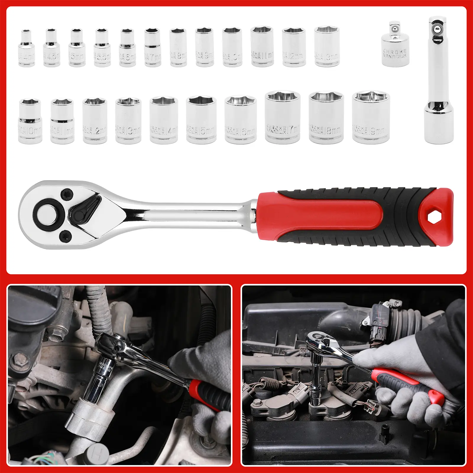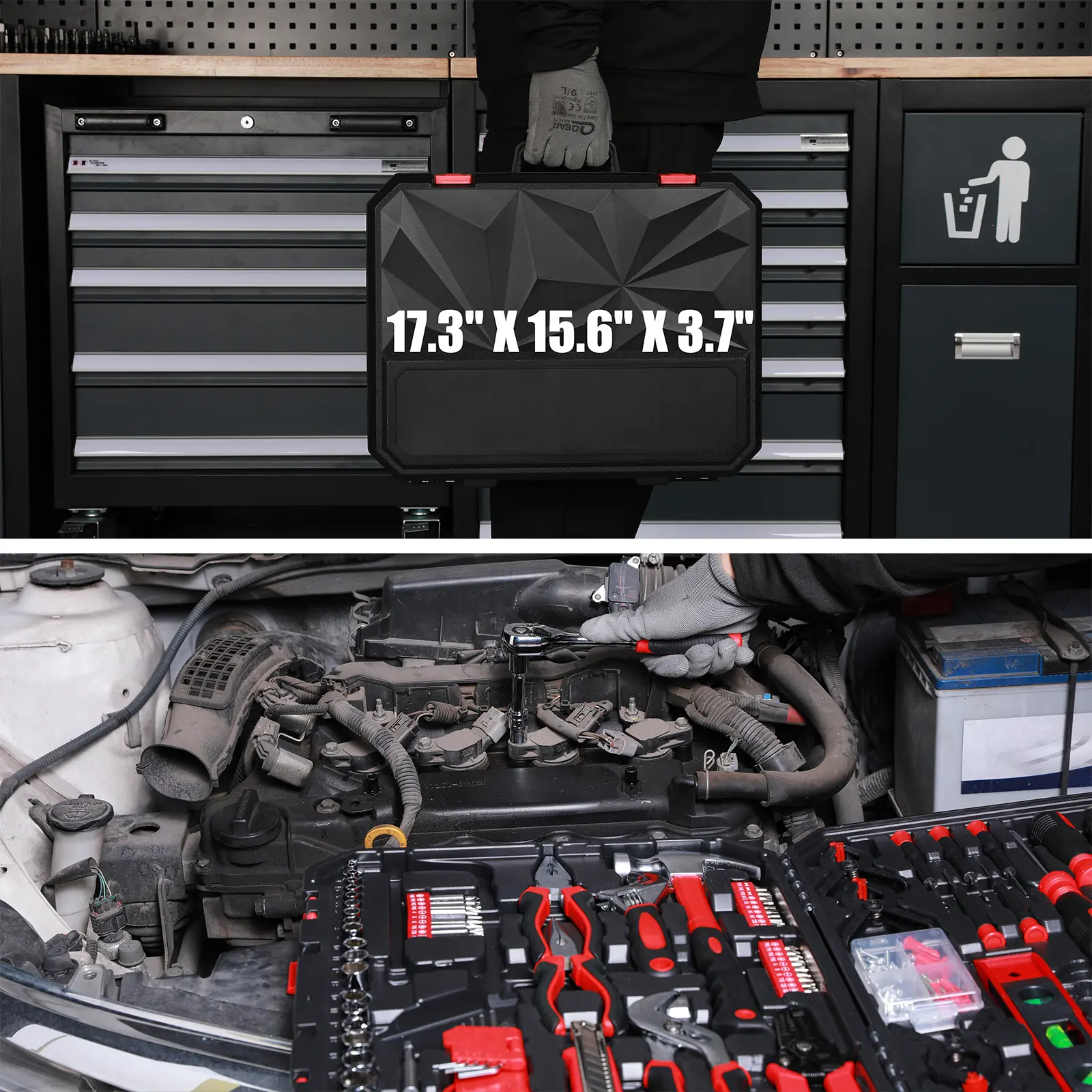 ·The auto repair tool kit comes with a plastic box for easy carry and convenient storage. Case size:17.3"*15.6"*3.7"