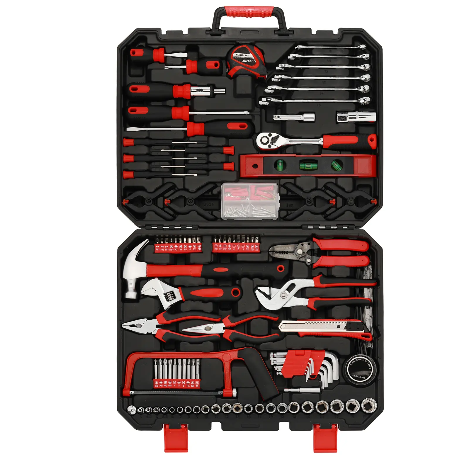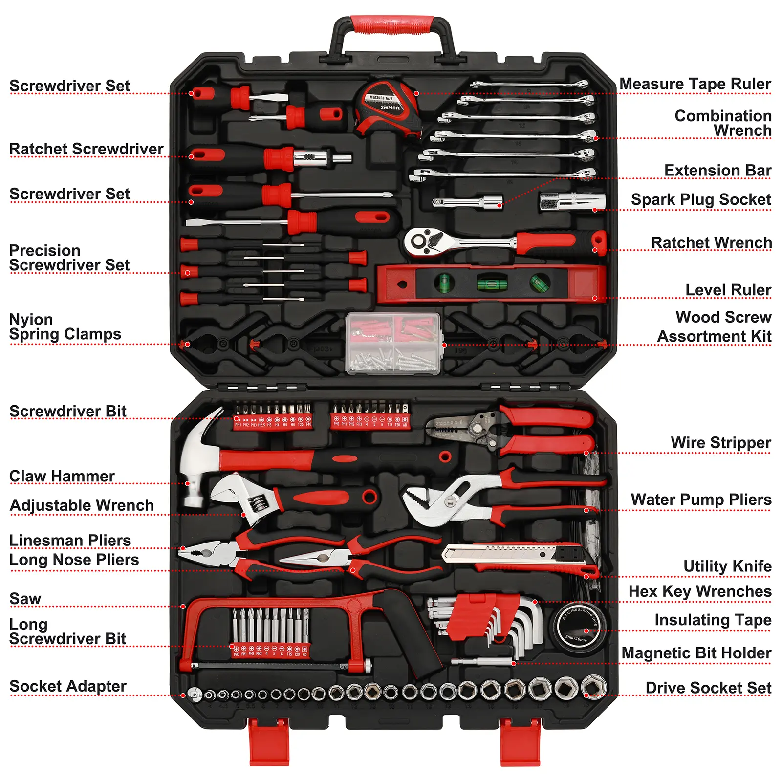 ·This is an complete multi-purpose hand tool set that contains a carefully selected assortment of the most reached-for hand tools and sockets used for automotive, mechanical, and household repairs. Ideal for the home, garage, workshop, and DIY enthusiasts. Contains tools needed for most small repairs and basic DIY projects around the house.Perfect for Handyman’s, repairmen, mechanics, body shops etc. Also a great tool set to have at home, garage and the workshop