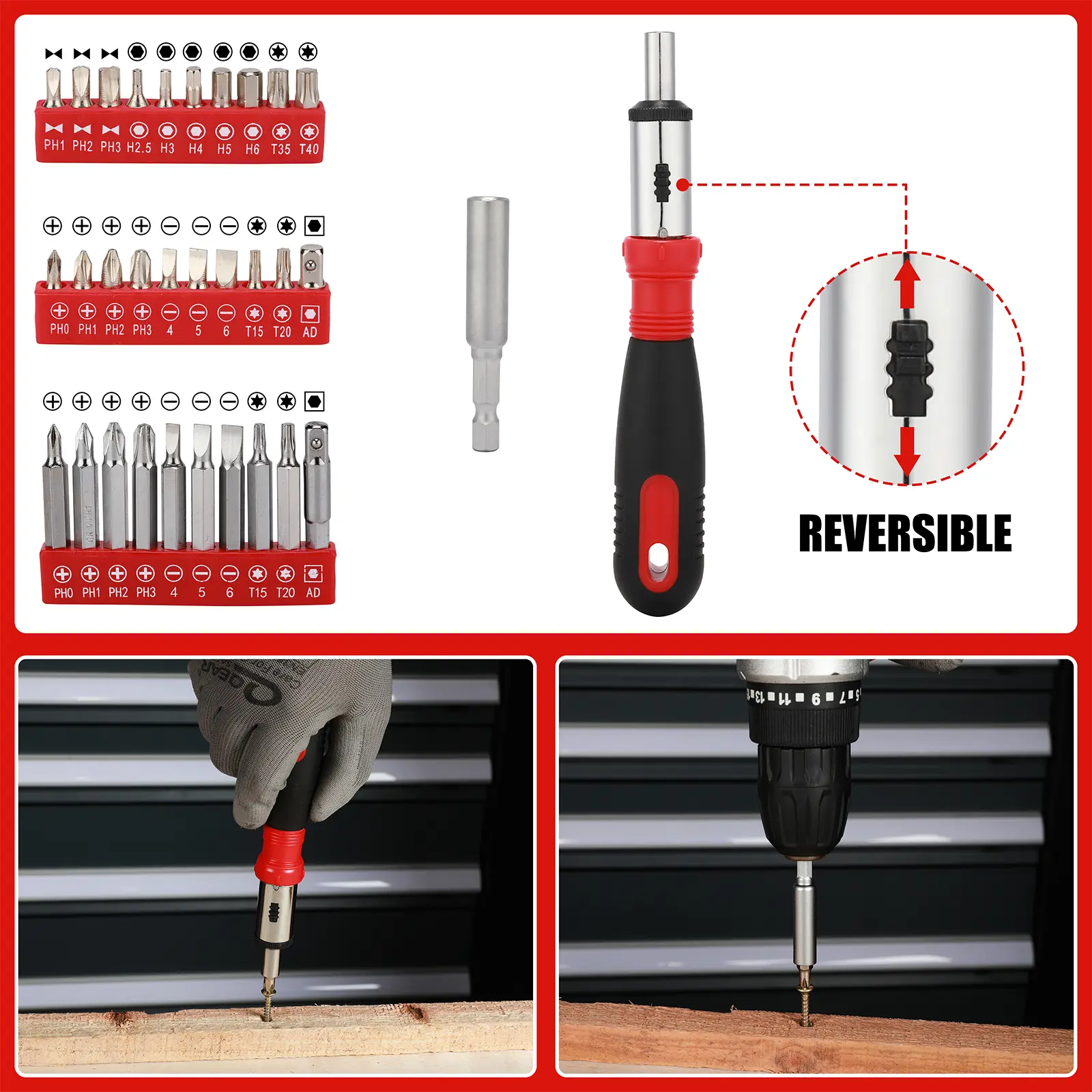 ·205-Piece household tool kit combines most popular sockets, wrenches, and hex keys for easy accessibility. Also includes the most common screwdriver bits, combination wrench, pliers, knife, adjustable wrench, rip claw hammer, spinner handle and more