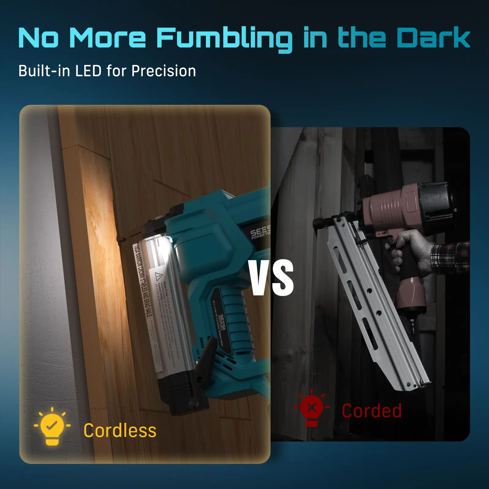 Illuminates dark, tight spaces (e.g., under cabinets, corners) for precise nailing in low-light environments. Enhances visibility during hard-to-reach tasks.