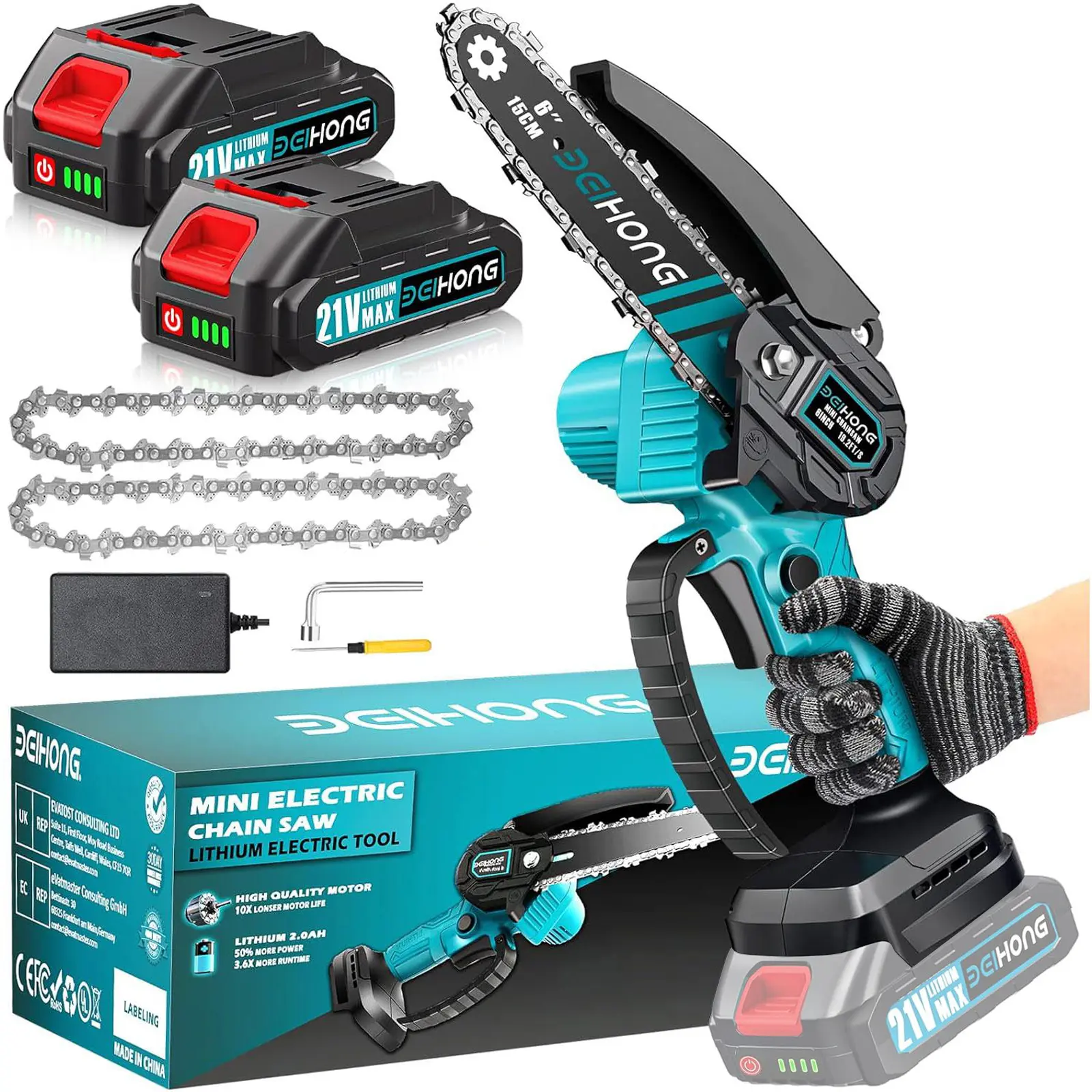 OK, I ordered this in the middle of the night on Wednesday and received it at 2 PM on Friday. It came with gloves, glasses, a screwdriver oil and extra chain two batteries and it’s very very light.weight! I’m extremely impressed. I’m charging up the batteries now and I will be using it in the morning, but I just have to tell you how amazed I am with the prompt delivery and what came in the box!