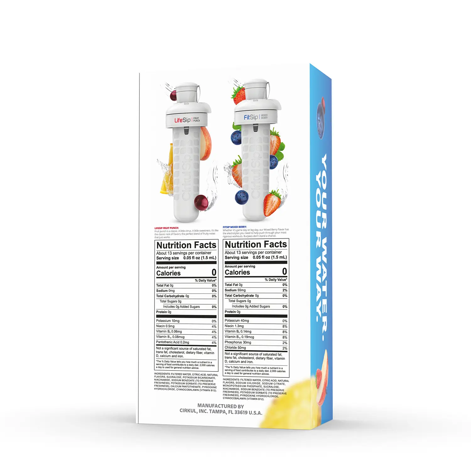 Ready to elevate your water game? This 22oz. Plastic Bottle Starter Kit is your perfect introduction to Cirkul. It includes an innovative water bottle and 2 flavor cartridges: LifeSip Fruit Punch and FitSip Mixed Berry. No sugar, zero calories, and no artificial colors. Enjoy personalized, delicious hydration!