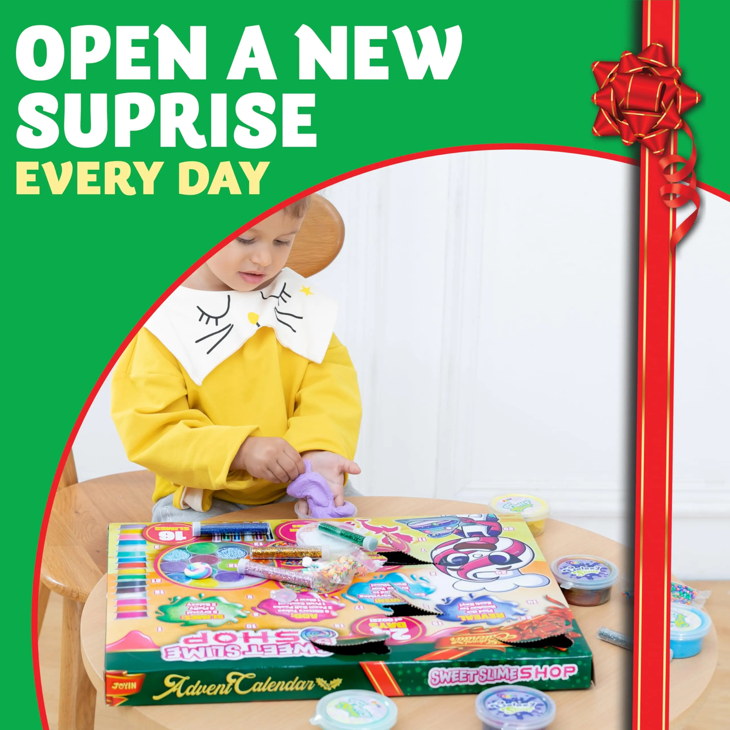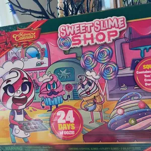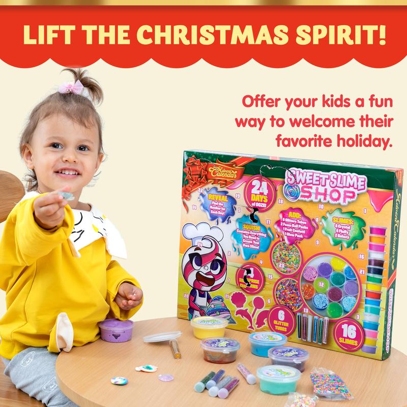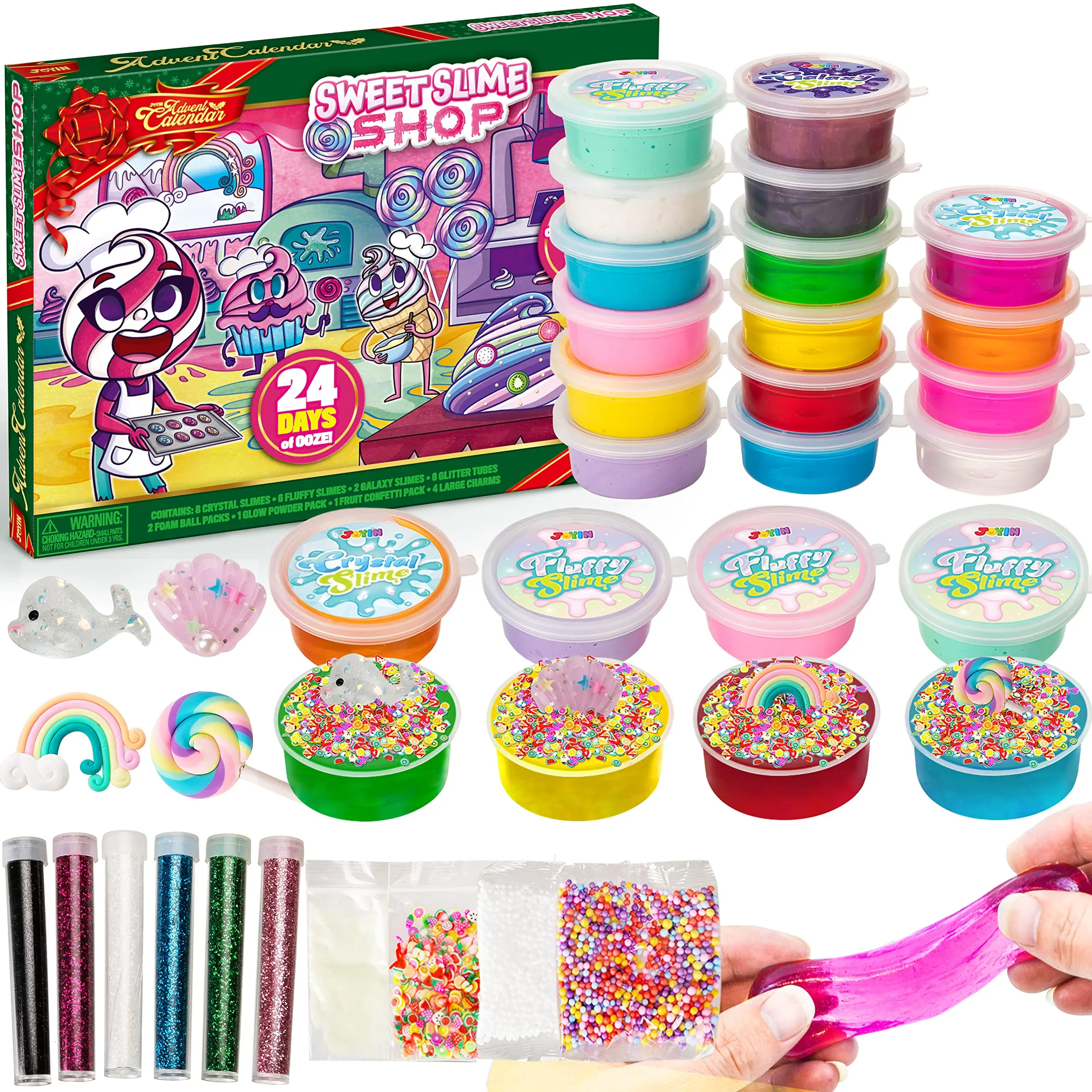 ·SUPER VALUE PACK.Our Advent Calendar includes 24 days Countdown, 6 Slime (White, Yellow, Light Green, Blue, Pink, Purple), 2 Galaxy Slime (Blue, Purple, Gold Blue, Purple, Red), 8 Crystal Slime (Red, Orange, Yellow, Green, Blue, Pink, Purple, Clear), 6 Glitters Tube (Gold, Purple, Blue, Silver, Pink, Green), 2 bags of Foam Balls, 1 bag of Fruit Slices, 2 bags of Soft Clay Decor, 2 bags Decor, and 1 bag of Glow in the Dark Powder.