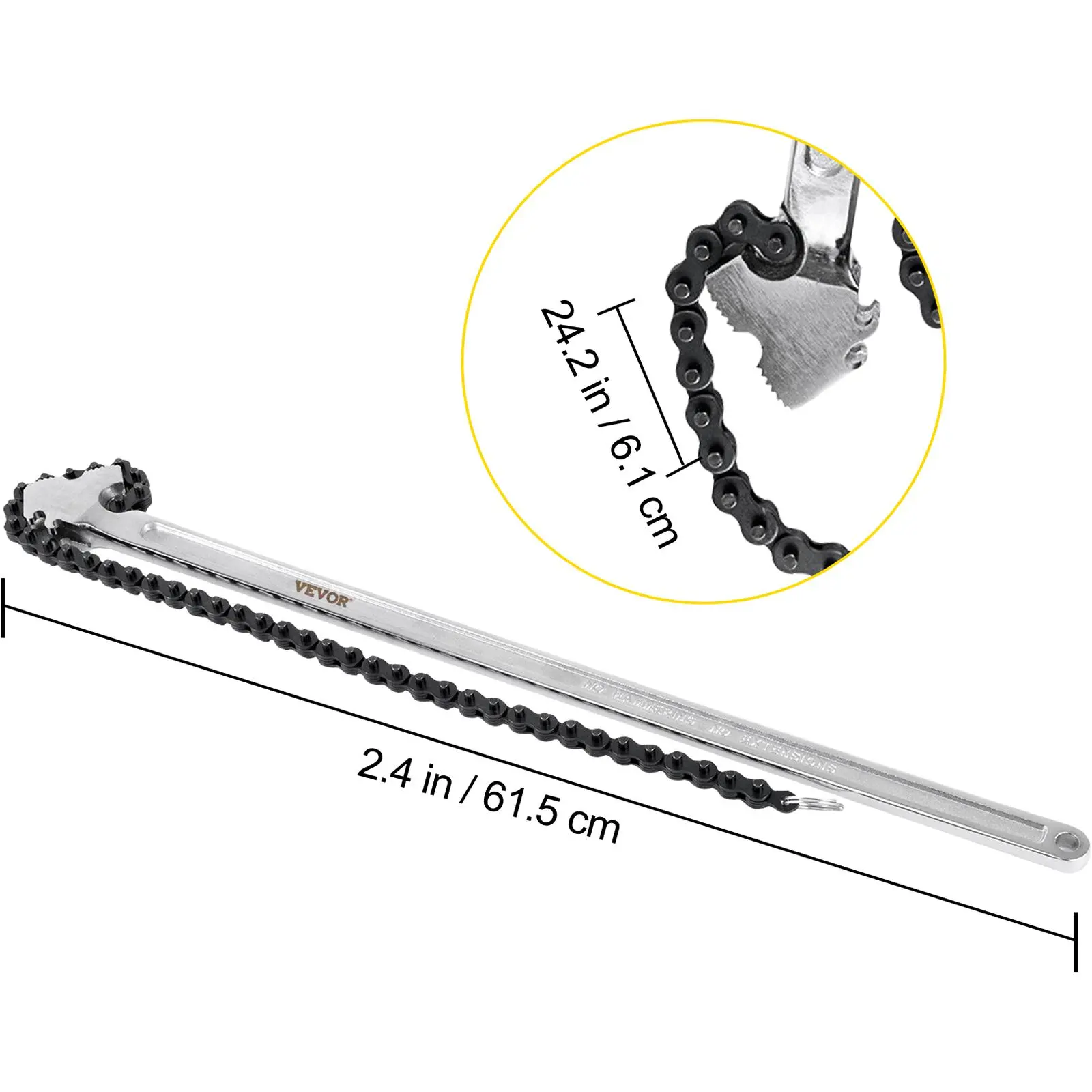 • 7" Clamping Capacity: The 24-inch wrench can clamp max pipe diameter: 6.7 inch/170 mm. It is designed to provide maximum locking force and bring more convenience to your work. The chain length: 22 inch/560 mm.