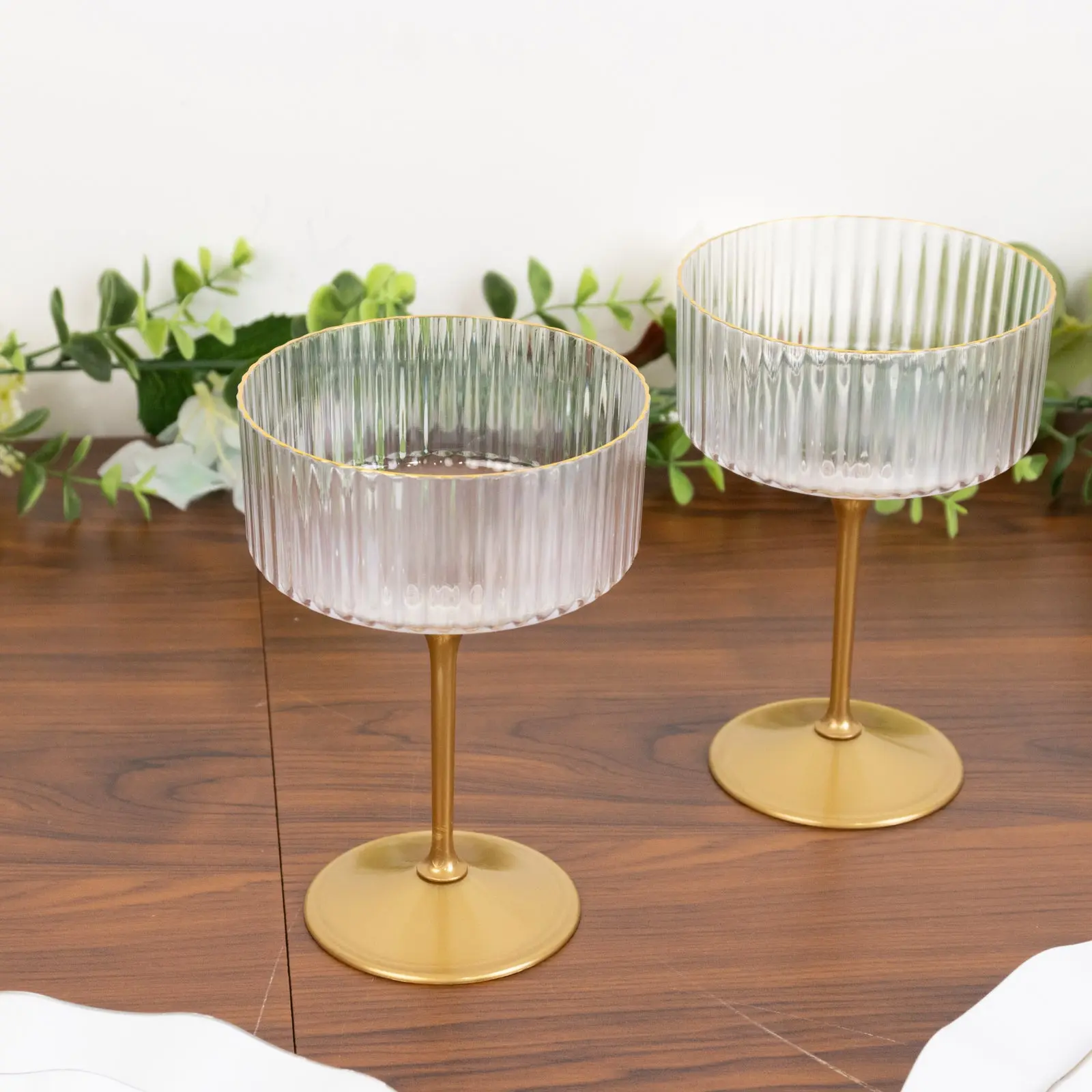 24-Pack Plastic Cocktail Glasses – 10oz Clear Ribbed Premium Disposable Coupe Champagne Cups with Gold Detachable Stem & Base – Party & Event Drinkware