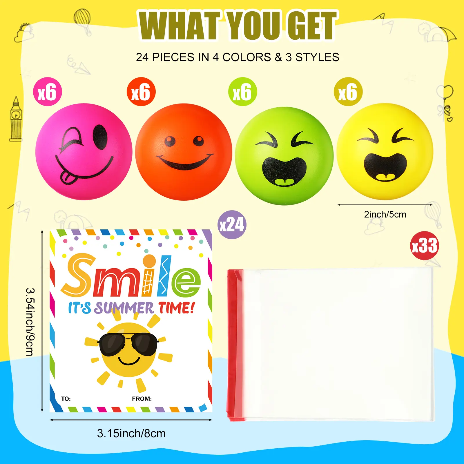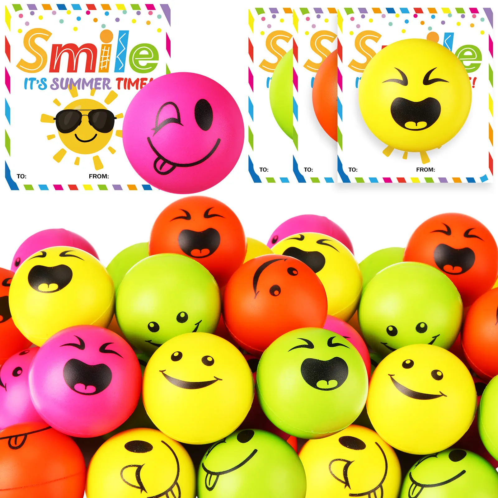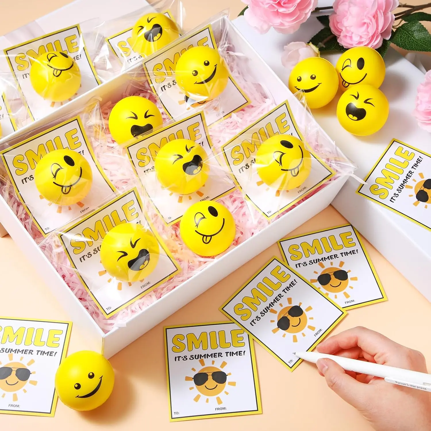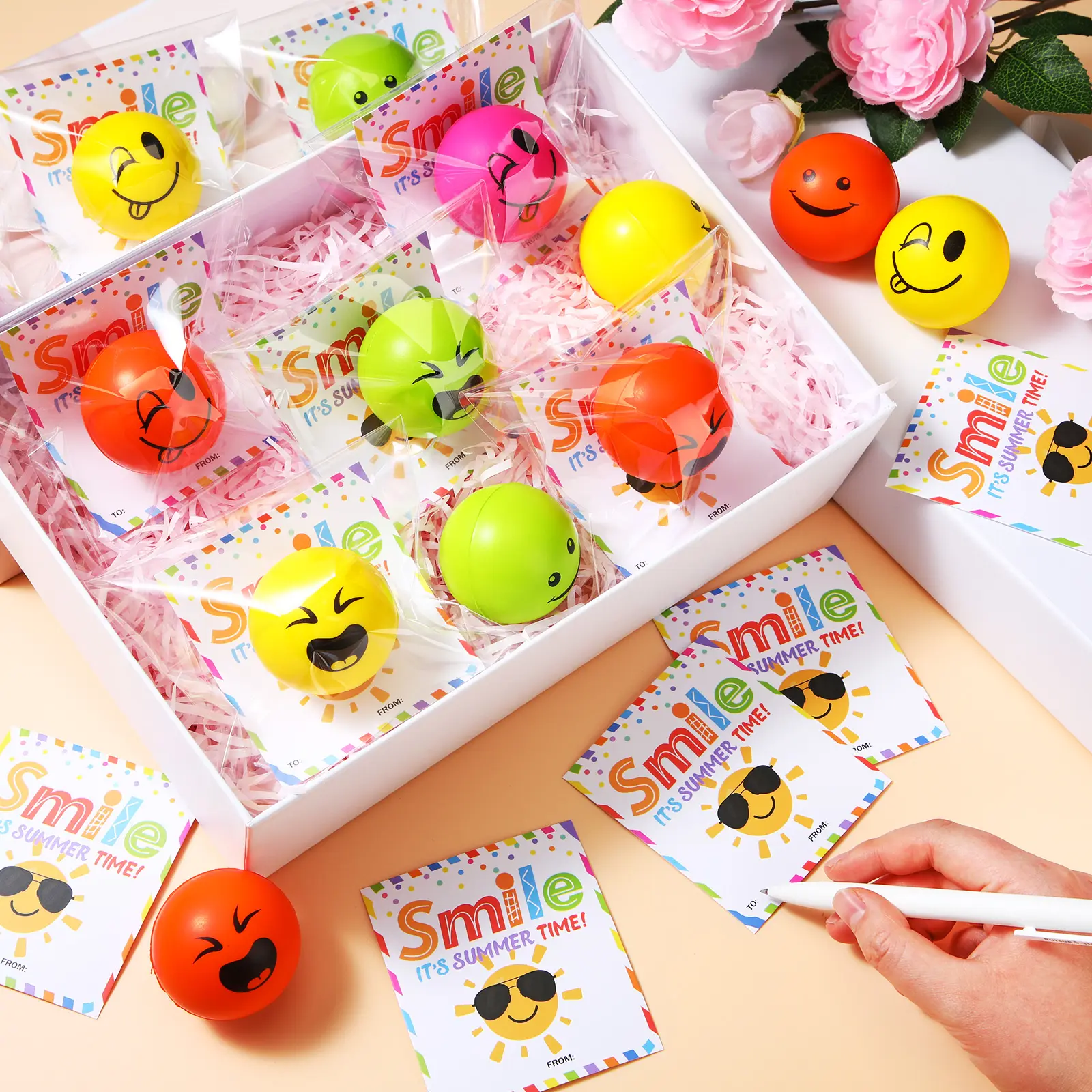 24 smiley stress balls + cards = the easiest, cutest summer party gift! Kids squeeze, parents chill, assembly takes seconds—perfect for class, pool days, or family trips 😄🍧#endofyeargift #endofschoolyear #squishy #stressball #partyfavors