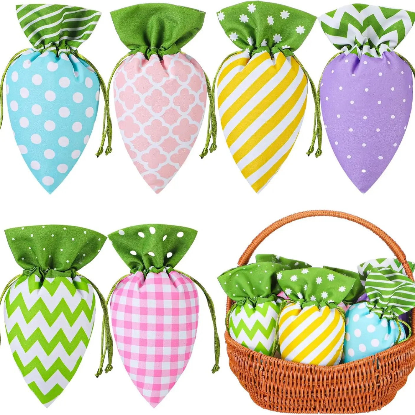 ·Pattern Style(24 Pcs):this fabric Easter treat bag bulk contains 24 carrot shaped bags in 6 styles, 4 of each; Each Easter carrot drawstring bag has its own characteristics in color and pattern, which ideally fits the atmosphere of Easter.