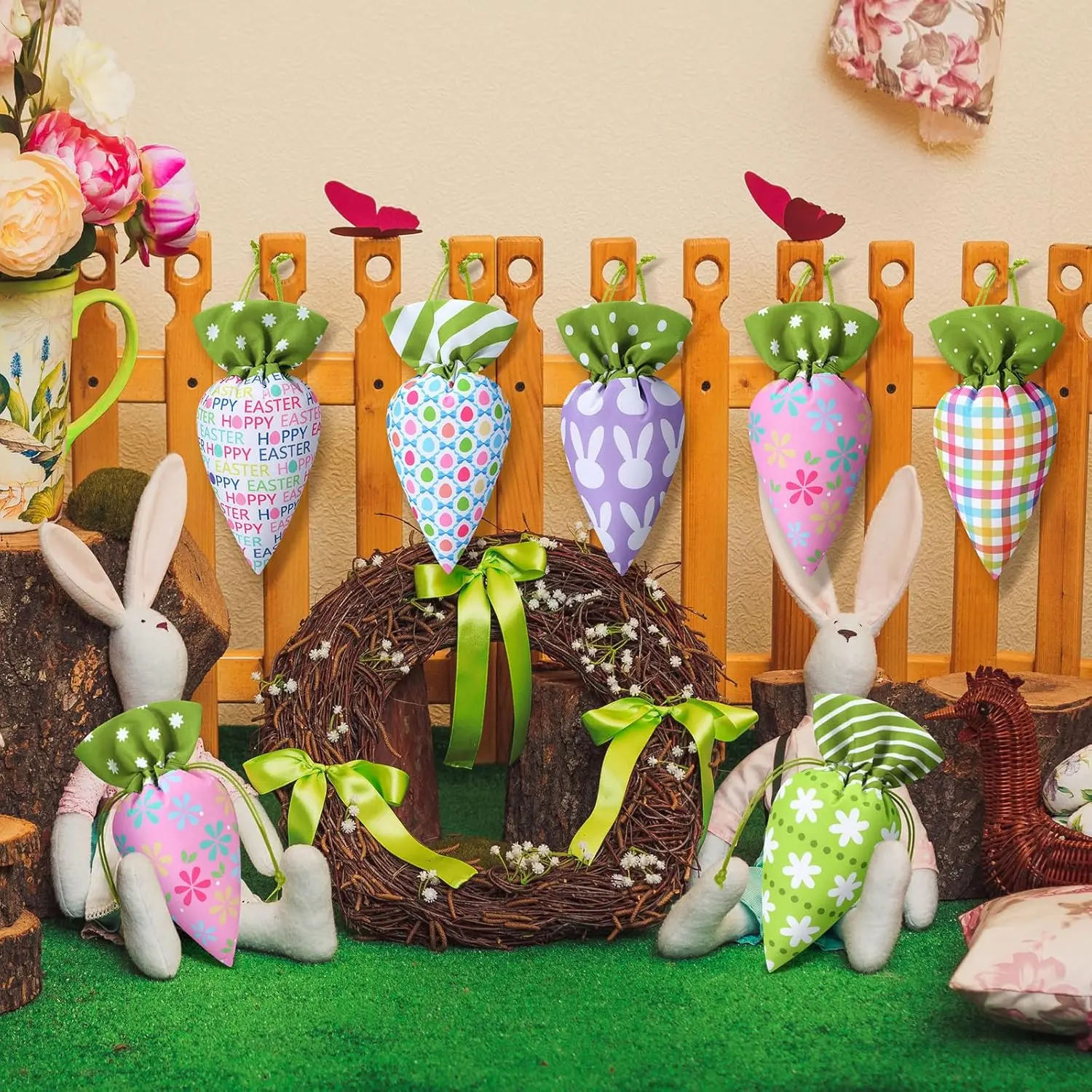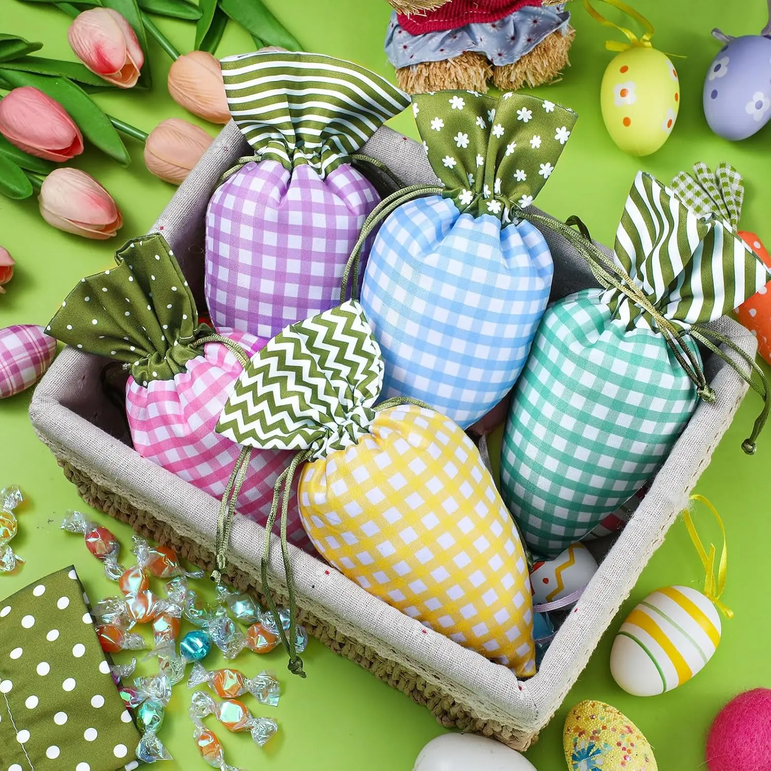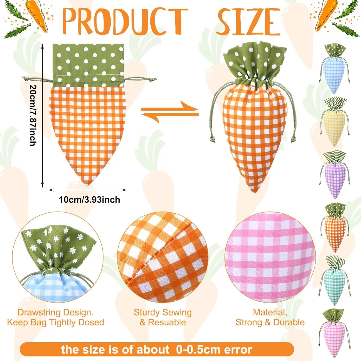 ·Plaid Style(12/24 Pcs):this fabric Easter treat bag bulk contains 12/24 carrot shaped bags in 6 styles, 4 of each; Each Easter carrot drawstring bag has its own characteristics in color and pattern, which ideally fits the atmosphere of Easter.