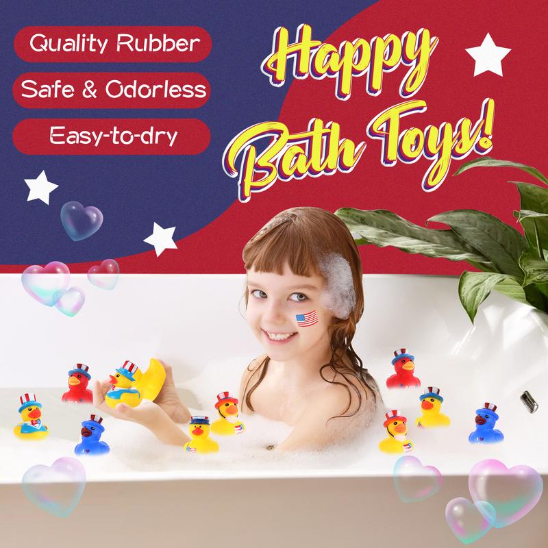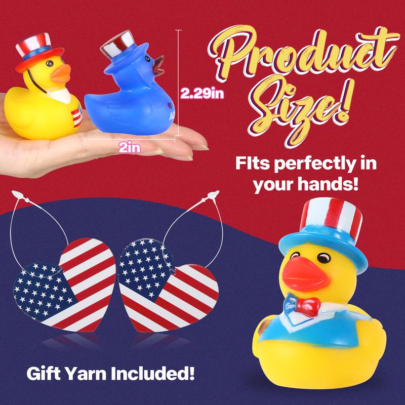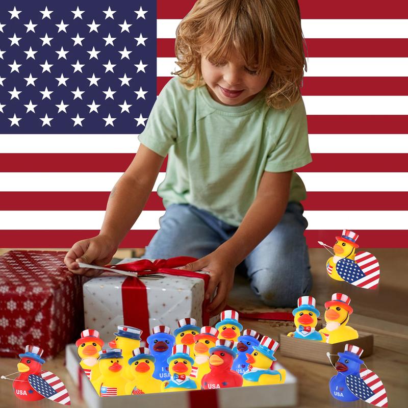 [Independence Day Rubber Ducks Set]24 Pcs Patriotic rubber ducks have different theme styles and shapes. THIS'S A SUPER VALUE PACK, which is enough quantities and various styles to meet your kids' needs for gift exchanging, to make this 4th of July more fun and meaningful. Patriotic Day, class Reward, party favors or daily life.