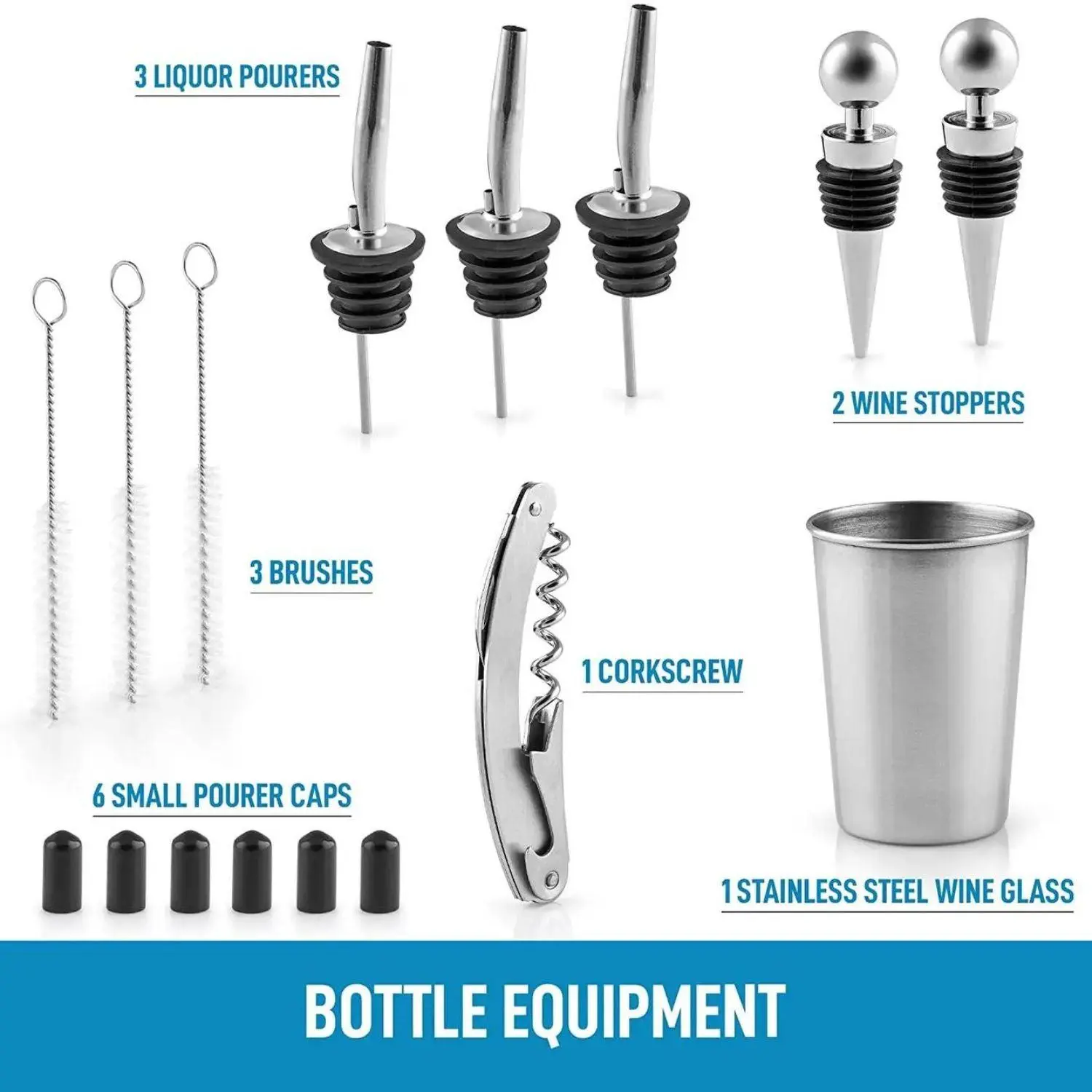 Items Includes: Shaker, Jigger, Mojito Muddler, Mixing spoon, Hawthorne Strainer, Corkscrew, 2 Bottle stoppers, 3 Liquor Pourers, 6 Pourer caps, 2 Pourer brushes, Velvet Carrying Bag