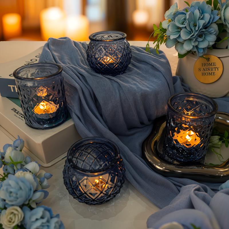 WELLIFE 24-Piece Blue Votive Candle Holders Set – Tealight Candle Holder Glass with 12 Round & 12 Textured Cups, Elegant Blue Candle Holders for Weddings, Parties, Home