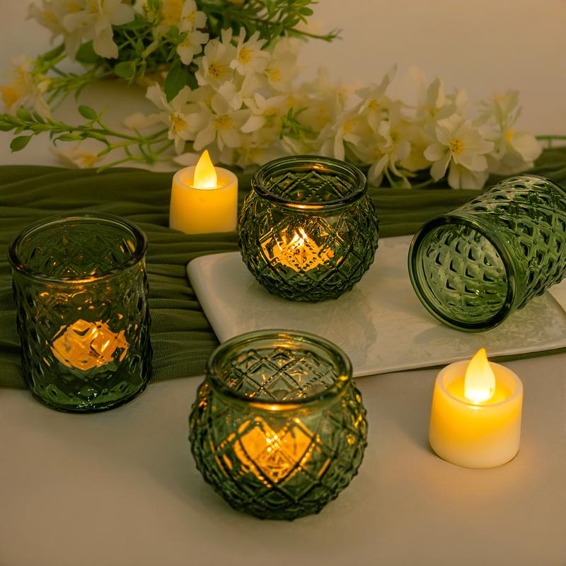 WELLIFE 24-Piece Green Votive Candle Holders Set – Tealight Candle Holder Glass with 12 Round & 12 Textured Cups, Elegant Green Candle Holders for Weddings, Parties, Home
