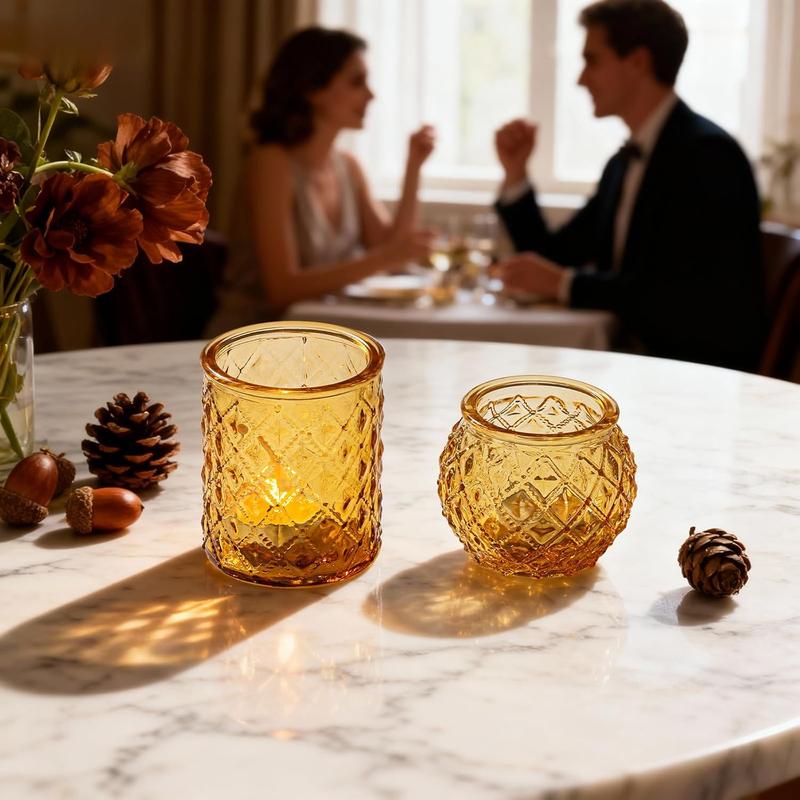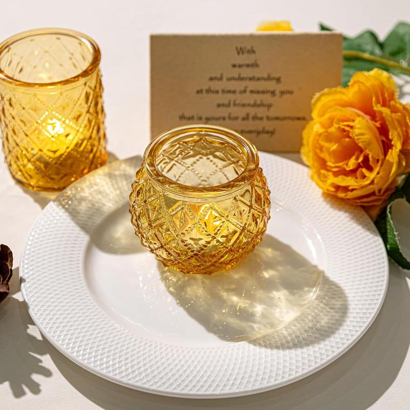 WELLIFE 24-Piece Amber Glass Tealight Holder Set – Elegant Diamond-Patterned Votive Candle Holders with 12 Round & 12 Textured Cups, Perfect for Weddings, Parties, and Home Décor