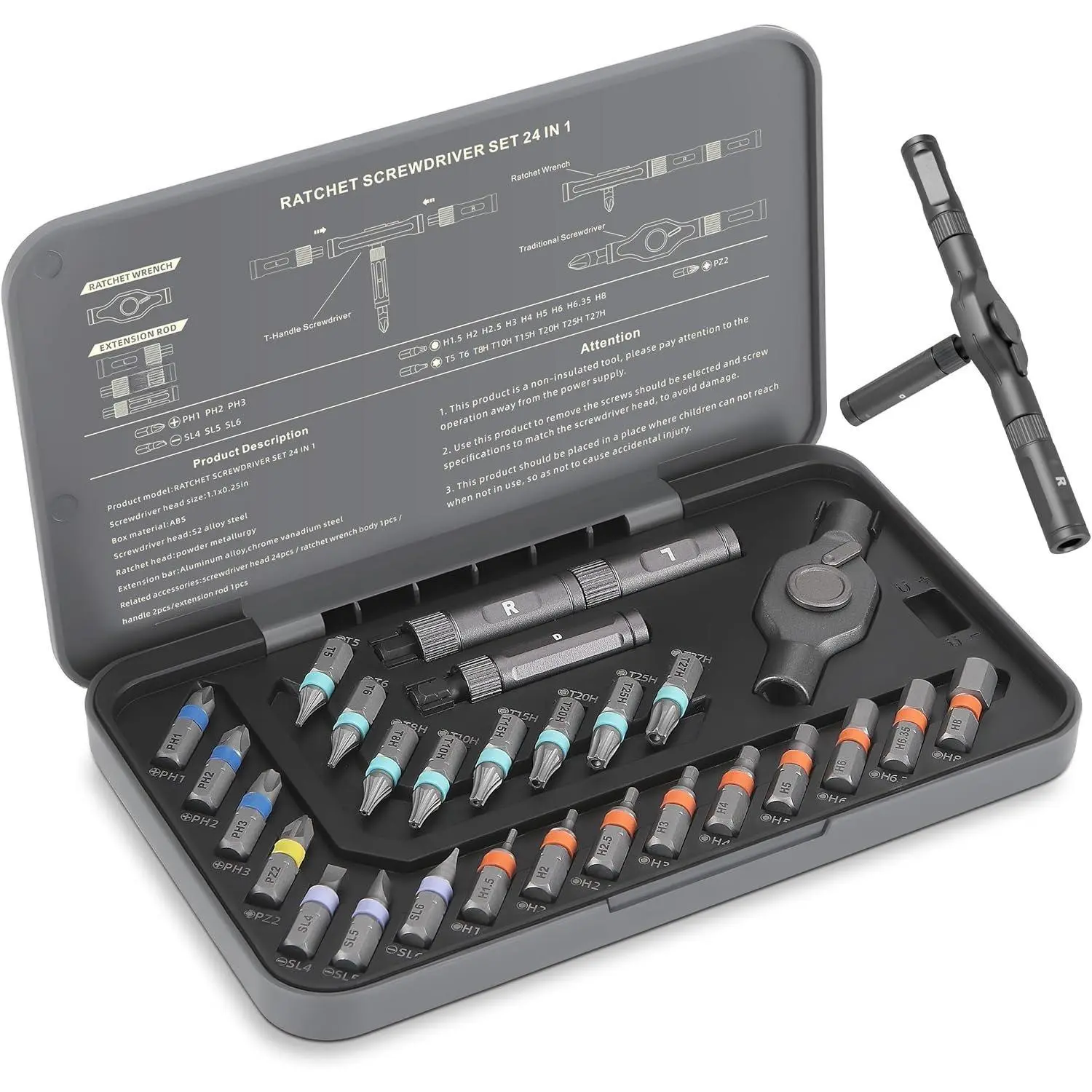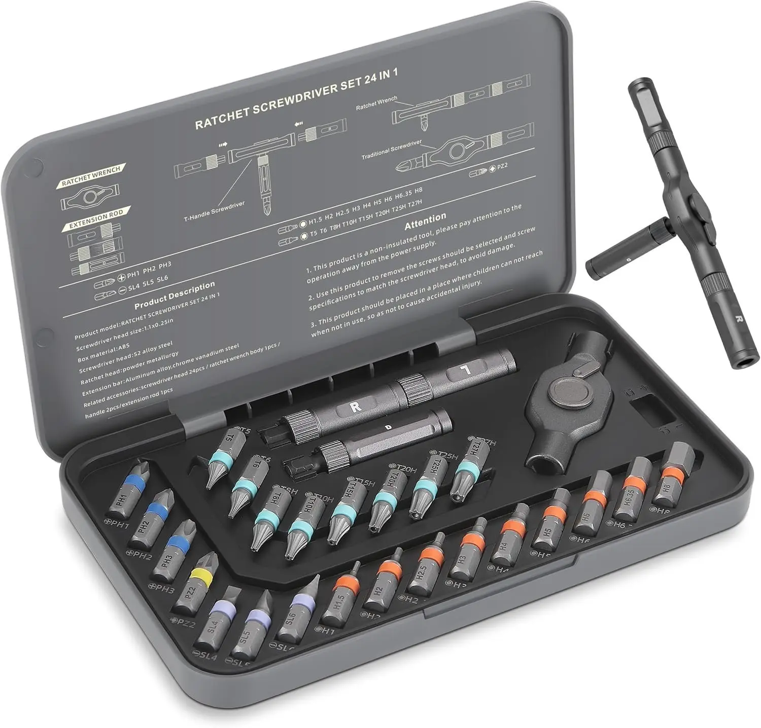 24 Vesatile Bits fo Evey Need: This 24-in-1 atchet scewdive set comes with a compehensive ange of pecision bits, including Phillips, flathead, Tox, and moe. Pefect fo assembling funitue, electonics epais, and eveyday DIY pojects.