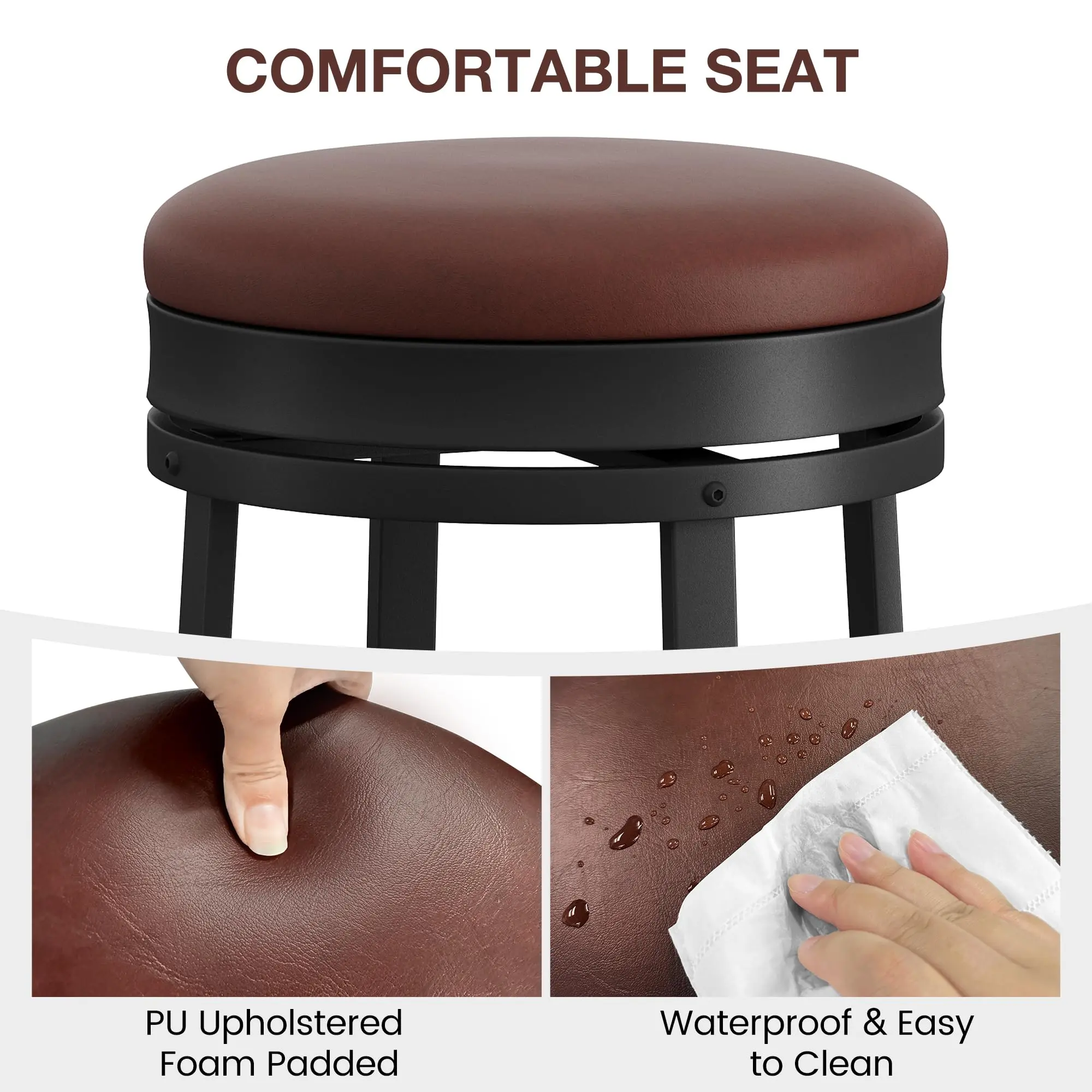 【Comfortable Cushion and Footrest】Designed for comfort, the black rotating bar stool boasts a luxurious PU leather surface coupled with high-density sponge for optimal cushioning. Plus, its 5.7" footrest height ensures you maintain the most comfortable seating position.