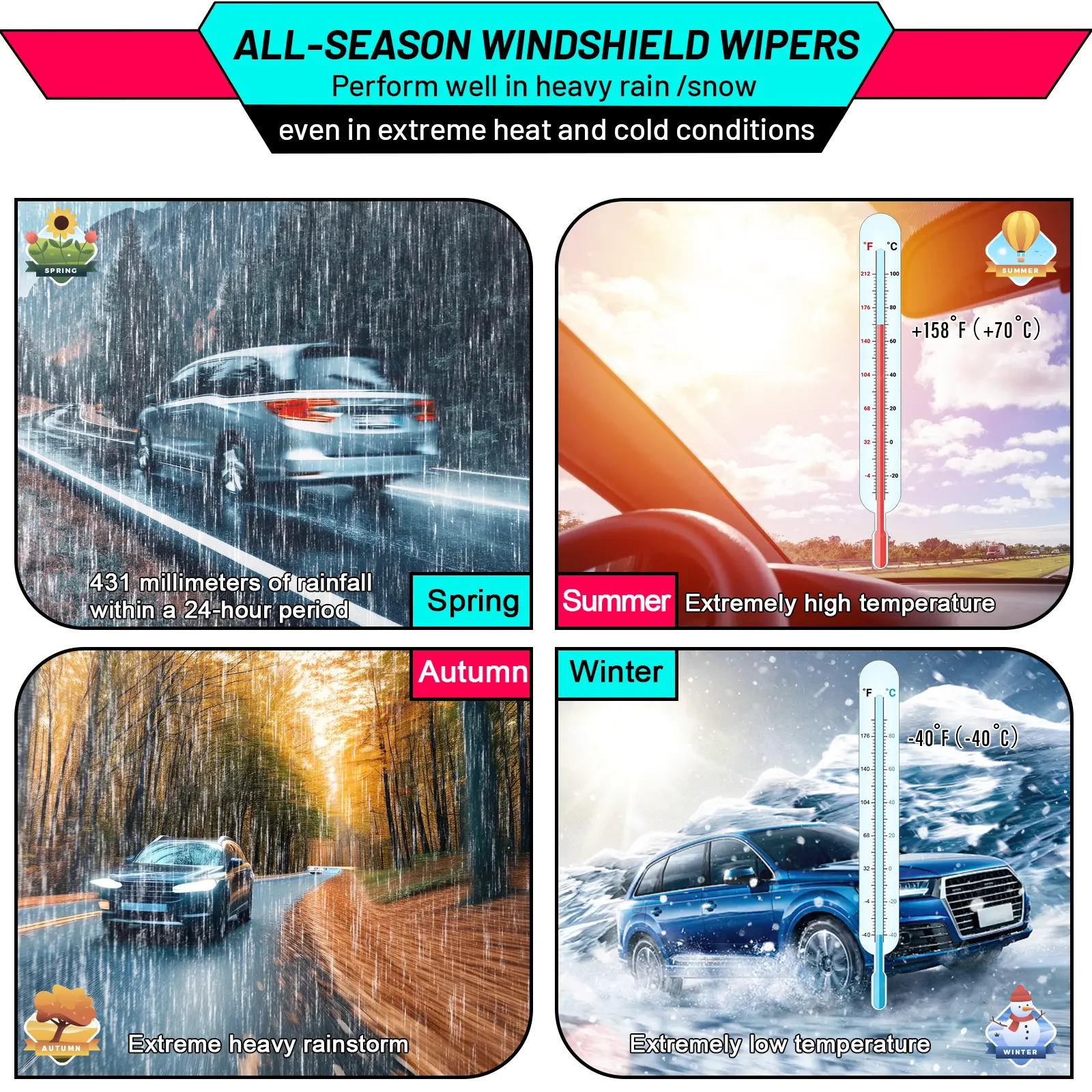 ·100% Brand New Wiper Blades: Suitable for various weather conditions and seasons, ensuring excellent performance whether in cold winters or hot summers.