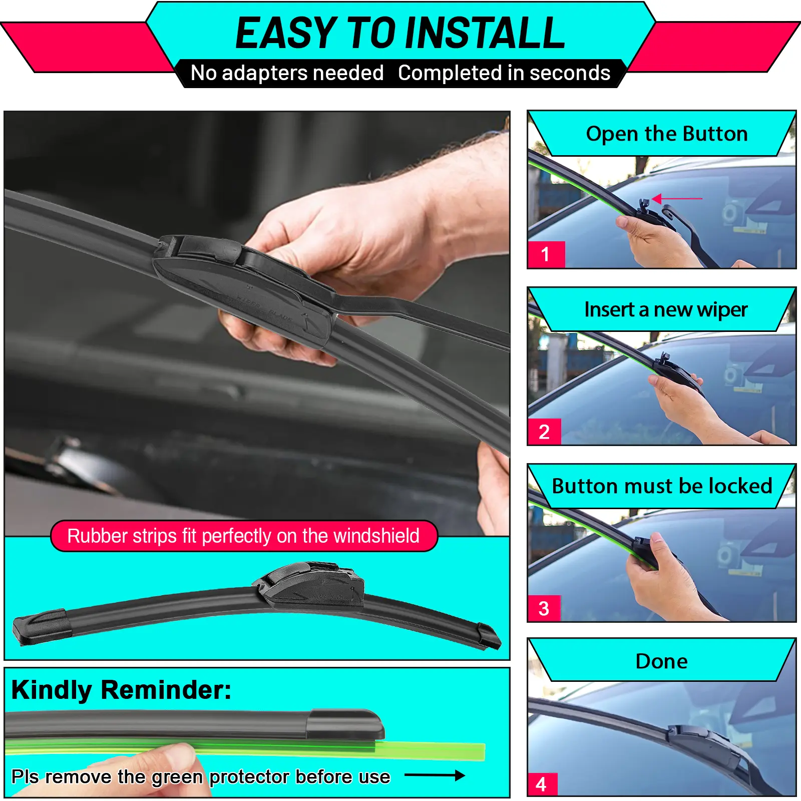 ·Patented Design Wipers: Unique design seamlessly combines functionality and aesthetics, specially designed for (9*3 & 9*4) U/J hook wiper arms, no need for cumbersome adapters, installation takes only a few seconds.