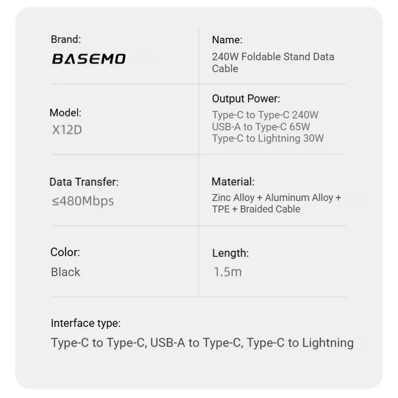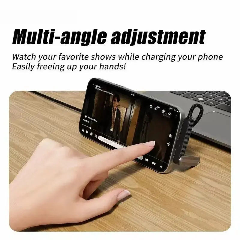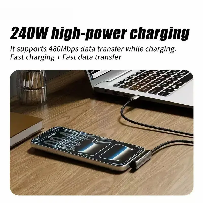 240W Super Fast Charging Cable with built‑in foldable phone stand, Type‑C to Type‑C, 1.5m braided cord. Supports 240W fast charging and 480Mbps data transfer. 360° adjustable stand for horizontal/vertical viewing, perfect for watching videos or gaming while charging. Durable woven cable, widely compatible with iPhone 15‑17 and all Android devices.