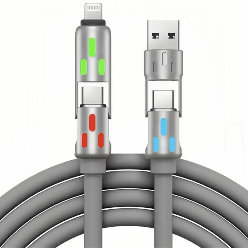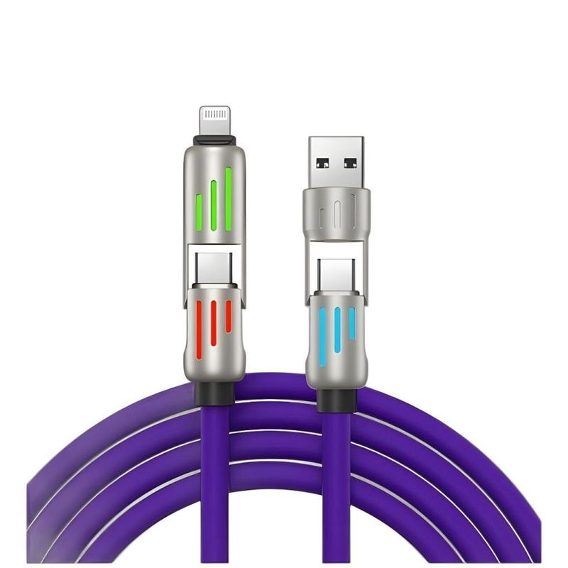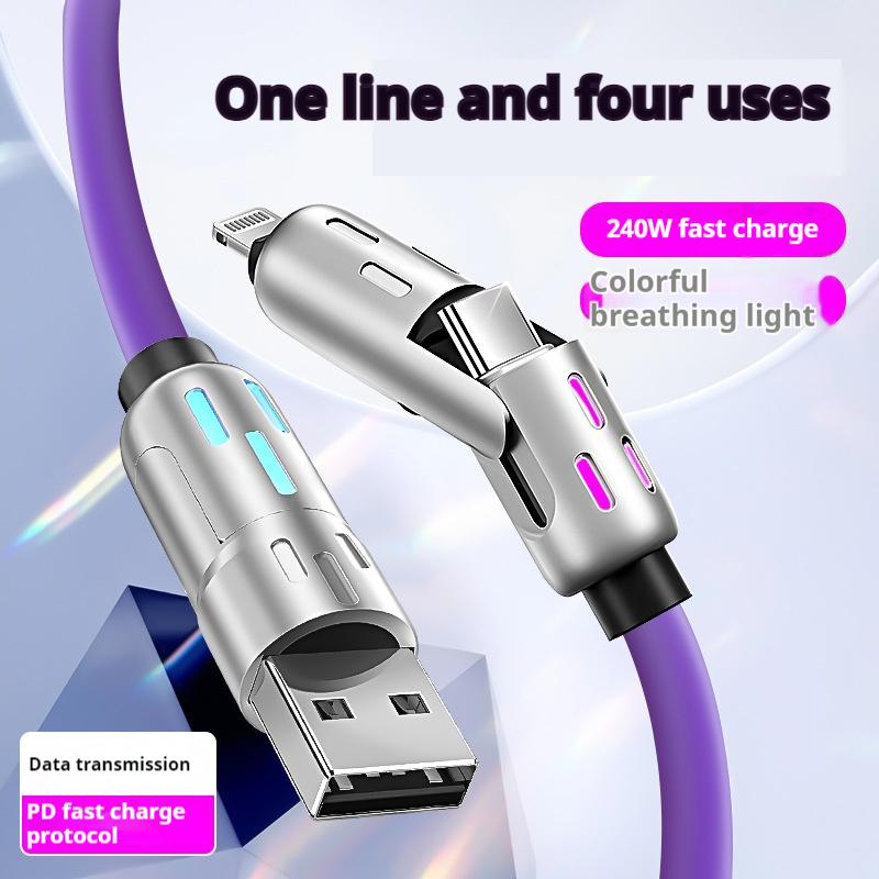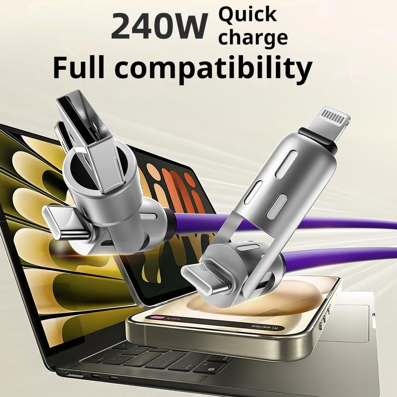 The 240W 4-in-1 USB Charging Cable offers high-speed charging and data transfer for iPhone 15/16, iPad Pro, Samsung, and more. Perfect for home, office, and travel, this cable ensures your devices never run low on battery. It's a colorful, multi-charging solution that syncs and charges quickly. Ideal for users needing a universal charger.