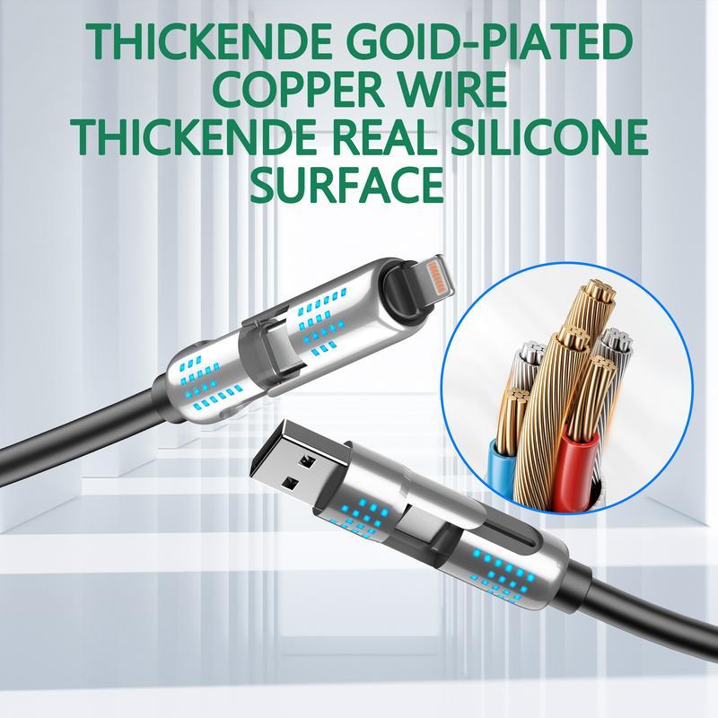 Ever juggle multiple chargers and cables for your phone, tablet, and laptop? Simplify your life with this 240W USB-C cable featuring 4-in-1 ports. It combines USB-C to Lightning, USB-C to USB-C, USB-A to USB-C, and USB-A to Lightning connectors in one sleek, durable design. Whether you're charging your iPhone, Android device, or laptop, enjoy fast PD 5A charging with power outputs up to 240W and reliable 480Mbps data transfer speeds. Built tough with zinc alloy connectors and a liquid silicone coating, this cable resists tangling and can handle over 100,000 bends — perfect for daily hustle. Plus, smart chips and 56KΩ resistors automatically adjust charging to keep your devices safe from overheating or overcharging. Included in the box is the versatile 4-in-1 cable ready to power up all your gadgets. Upgrade your charging game and cut the clutter with this all-in-one fast charging cable. Grab yours today and keep all your devices powered up effortlessly!