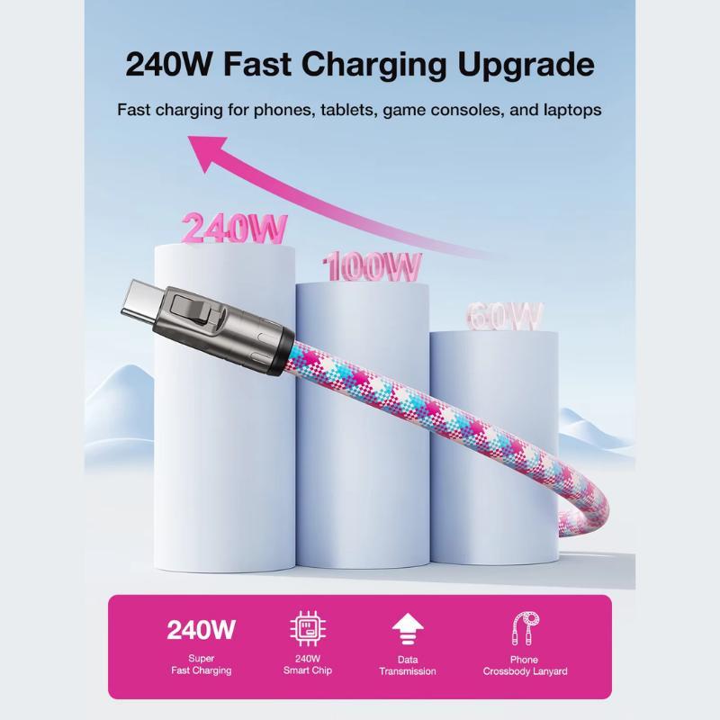 ✨ Hands-free carry + 240W charging + data sync in one. Wear around neck/wrist/backpack; 4ft cable for mobility. Perfect for charging on the go. Stay connected without interruptions. 📱