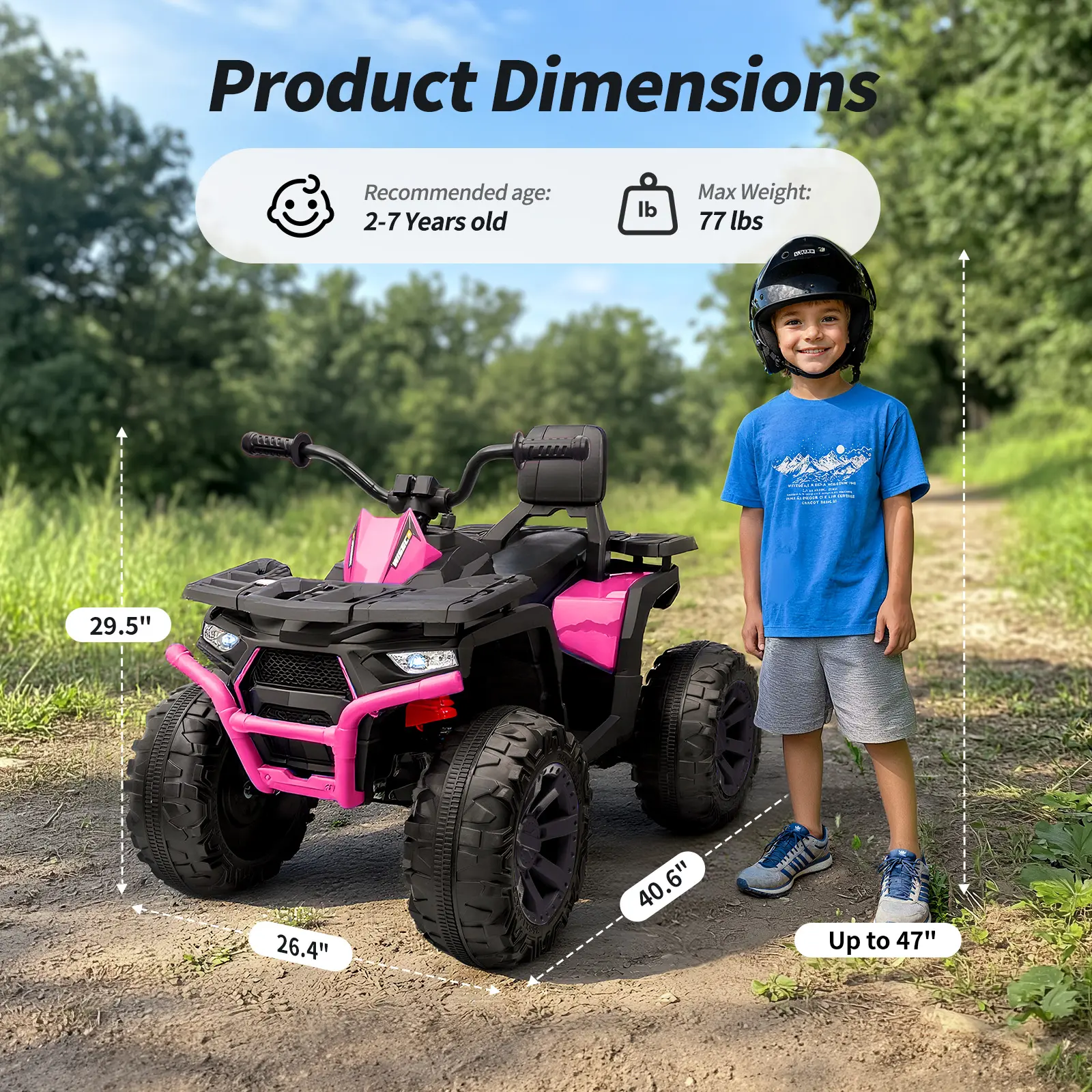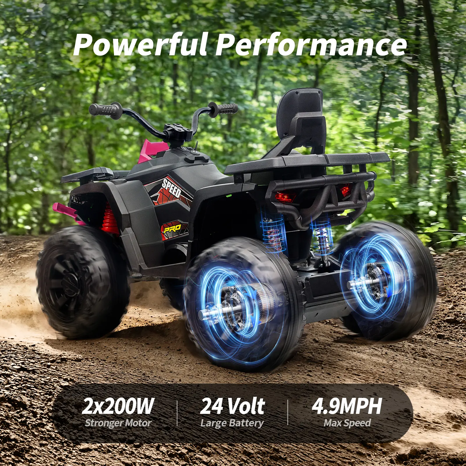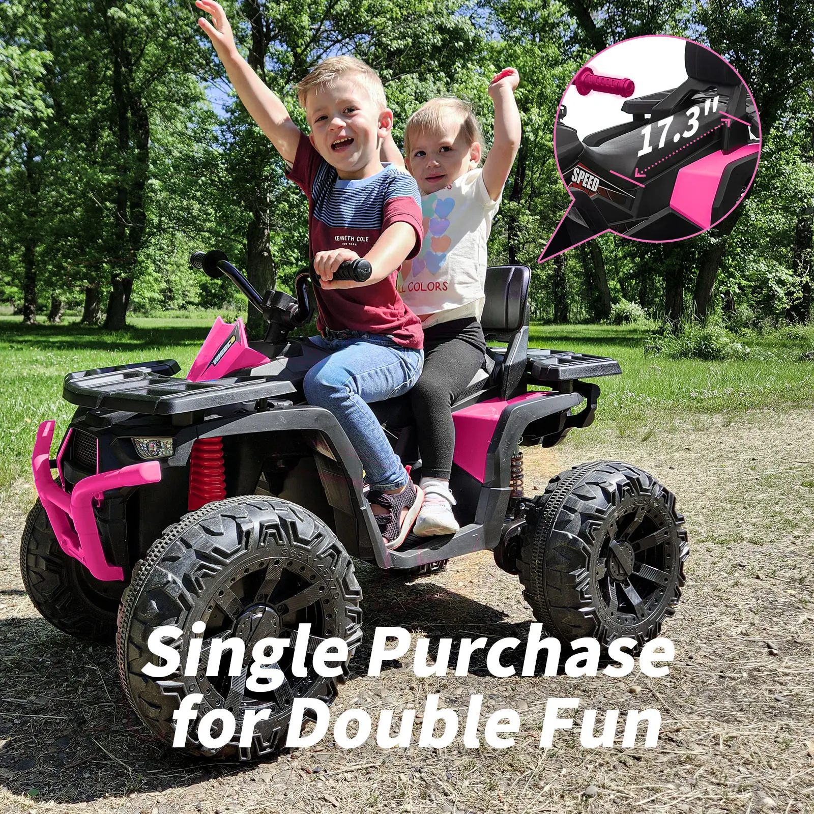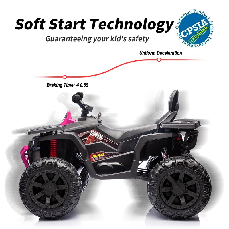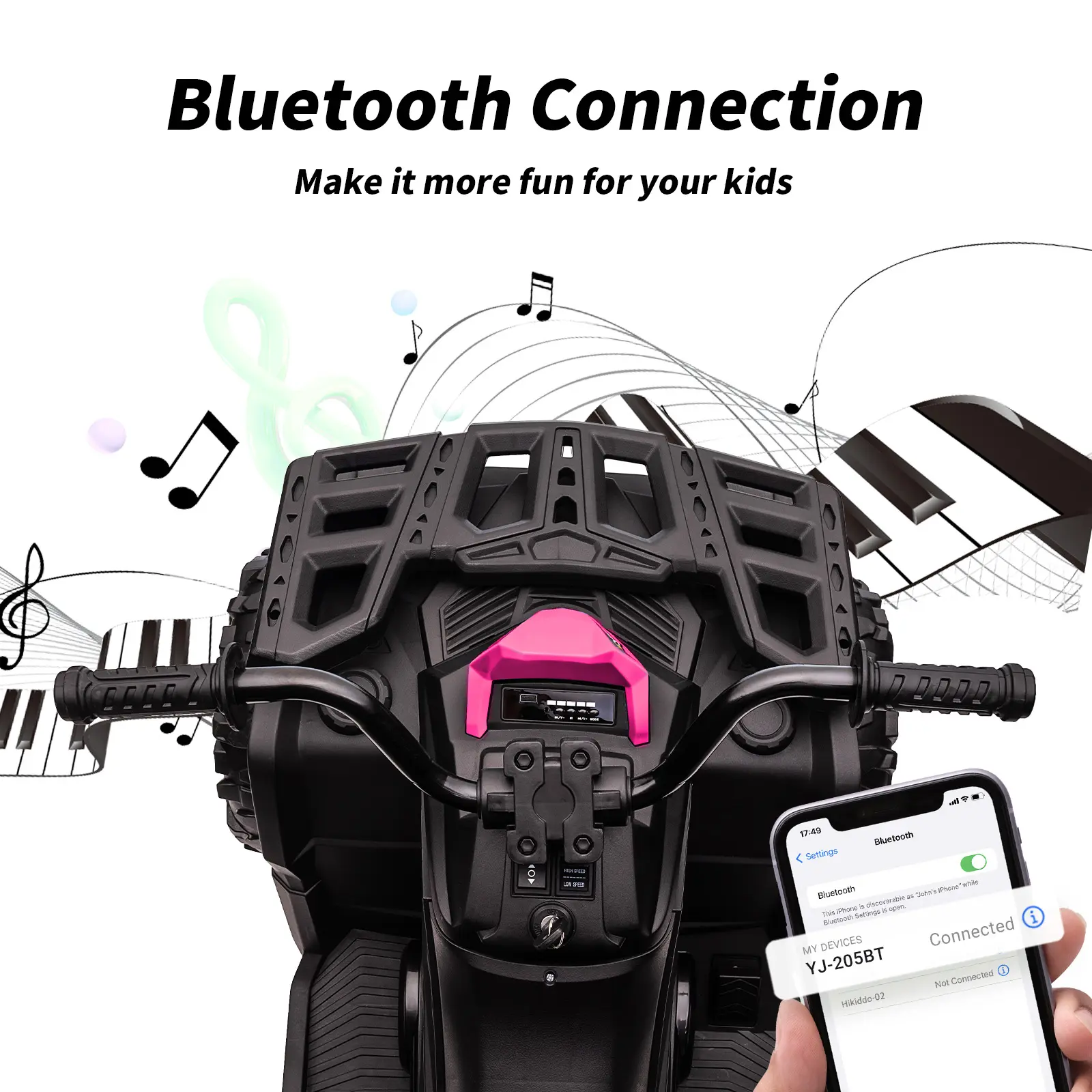Do your little ones love adventure? Hikiddo's 24V Ride on toy atv for big kids is an excellent choice to entertain your kids and let them explore their adventurous energy. Our 4 Wheeler kids ride-on atv for girls and boys feature 4 big wear-resistant wheels with spring suspension to ensure a comfortable and stable driving experience. This 24-volt powered ride-on toy for kids and toddlers is designed with a soft braking system, ensuring driving safety during emergency braking, also features with Bluetooth connection for more music fun. Equipped with powerful 24v battery, this 2 seater kids atv riding toys can offer 1 hour of playtime fun. Built with dual powerful 200w motors, the four wheeler ride on toy will reach up to 4.9 mph maximum speed per hour and bring your kids a wonderful driving experience.