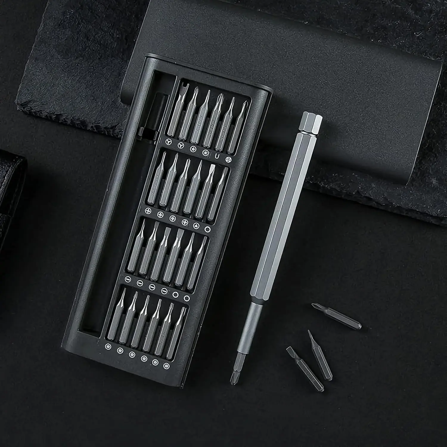 【25-in-1 Universal Compatibility】Fix everything from eyeglasses to gaming gear! 9 specialized bit types (Phillips/Flat/Torx/Pentalobe/U-shaped/Hex/Tri-wing, etc.) precisely handle screws in smartphones, tablets, smartwatches, PC and delicate electronics. No more searching for niche tools!