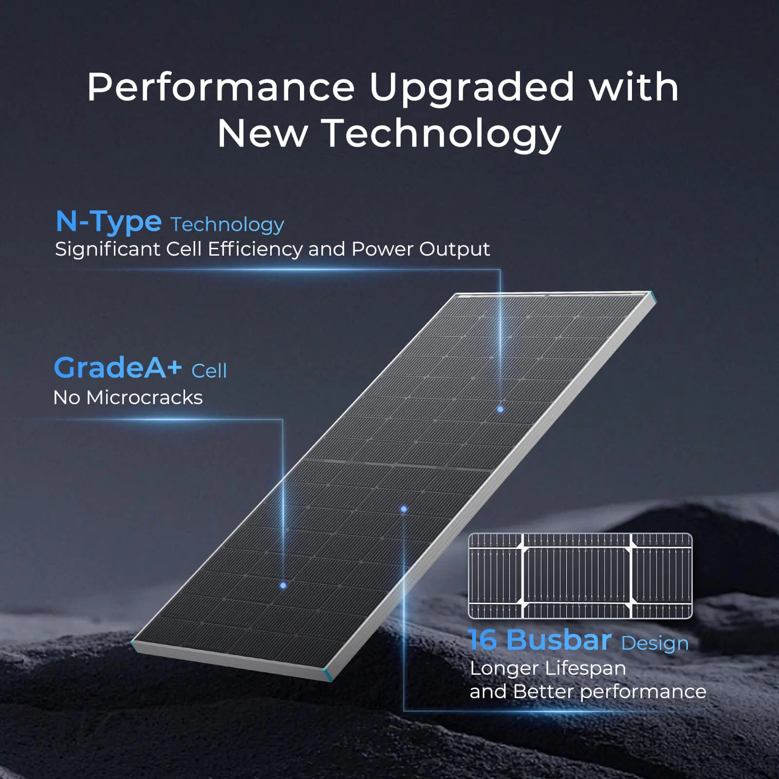 ·【16BB for Higher Conversion Efficiency & Longer Lifespan】Utilizing advanced 16BB cell technology, this n-type solar panel enhances photoelectric conversion efficiency while mitigating hot spots and hidden cracks, ensuring a longer service life and superior module performance.