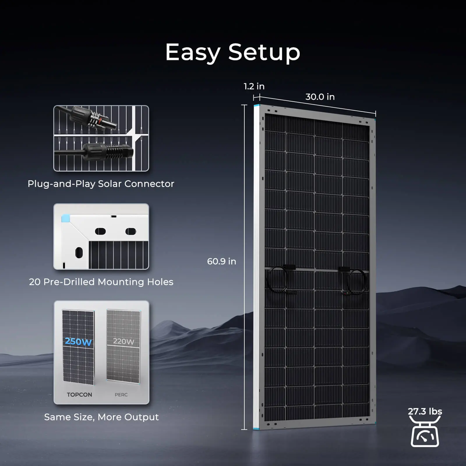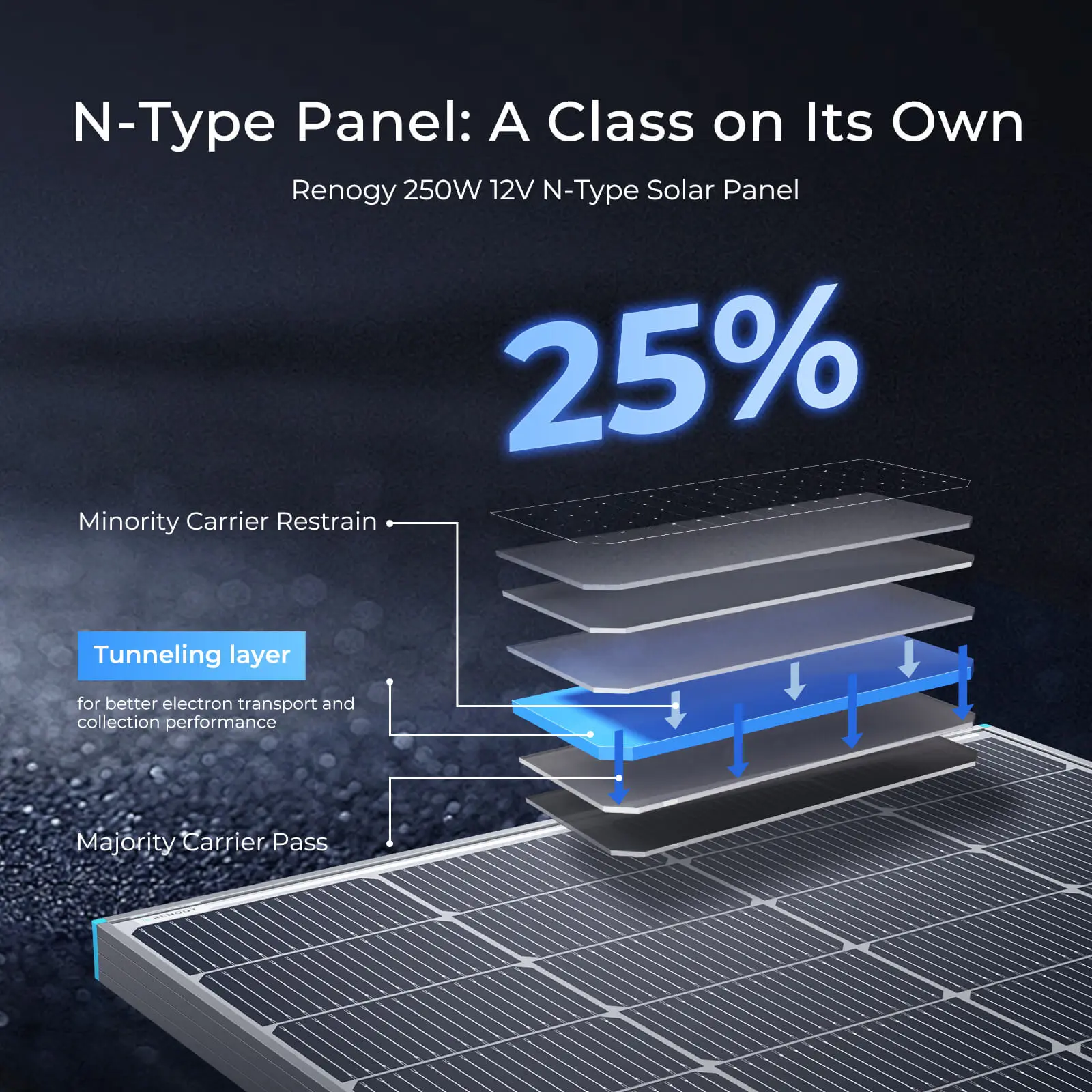 ·【Unmatched Cell Efficiency】 Renogy's N-Type Solar Panels feature grade A+ cells, delivering an impressive conversion efficiency of 25%.This provides 20W more power output compared to conventional p-PERC panels of the same design.