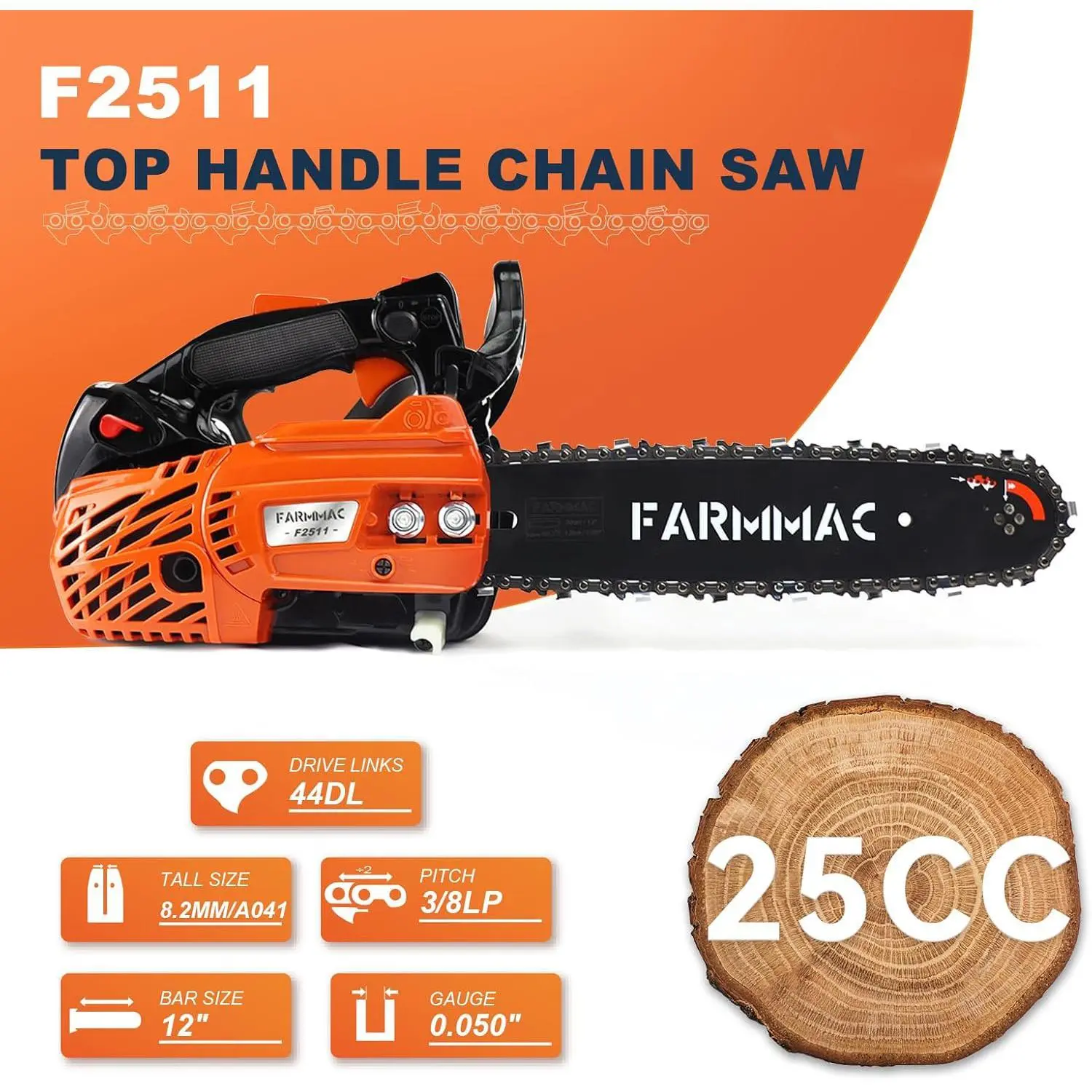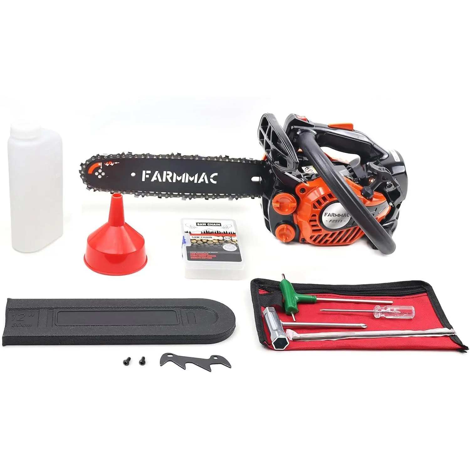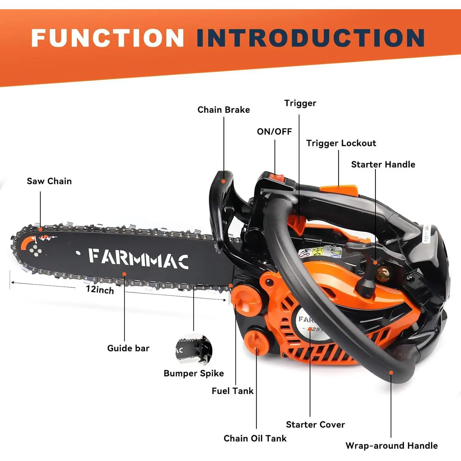 ·Weighing just 6.8 lbs, this chainsaw features a 12-inch guide bar and 0.050" 3/8LP 44DL chain. Its lightweight build and compact size make one-handed operation effortless. Perfect for lasting comfort during extended work.