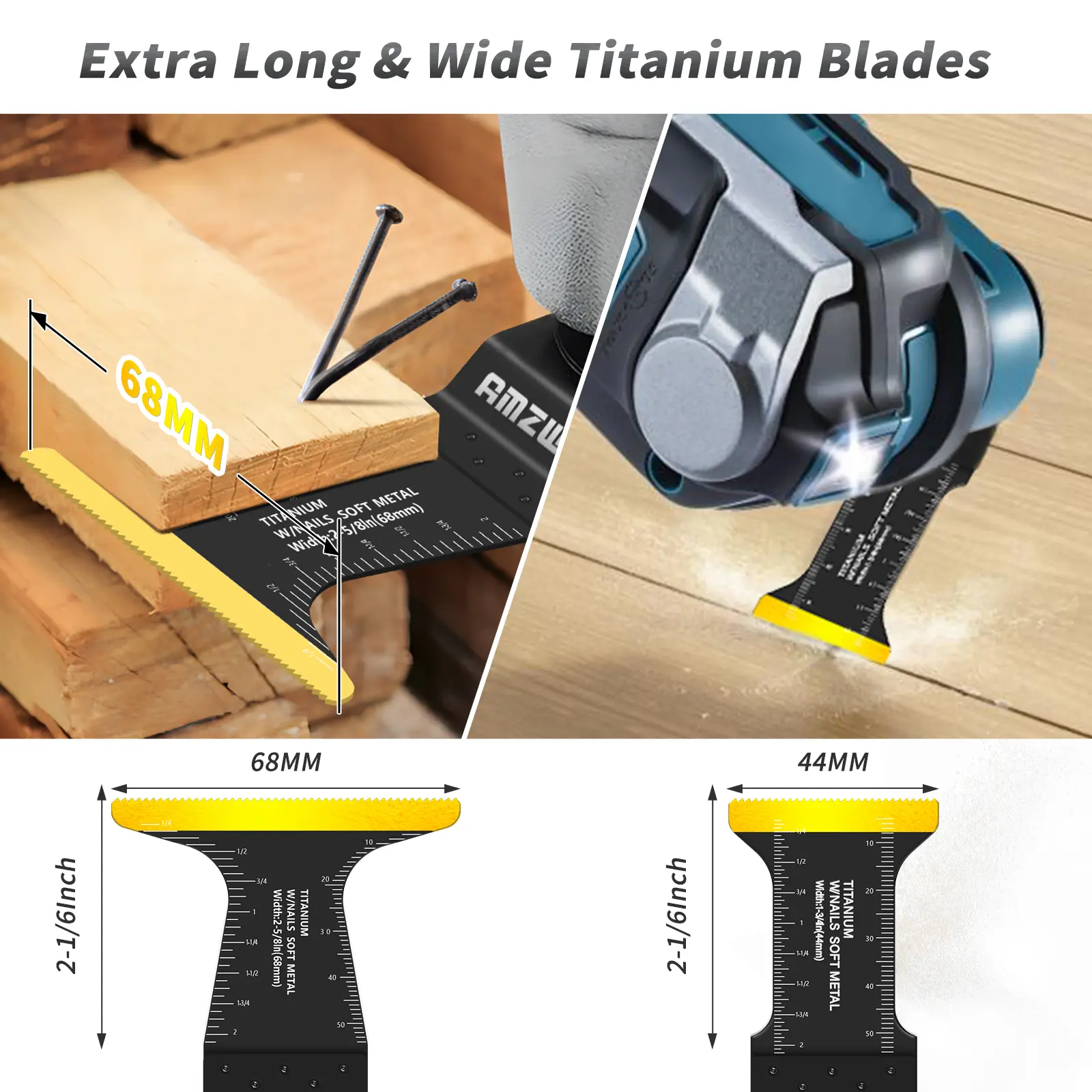·ARTWOWCUT Oscillating Saw Blades : Includes 5 types of blades: 56mm long titanium blades, 68mm wide & 34mm titanium-coated, and high-carbon steel saw blades. This versatile kit is your ultimate helper for home repairs, DIY projects, and professional tasks. Whether you're cutting wood, metal, or plastic, this multi-tool blade set ensures you’re always prepared.