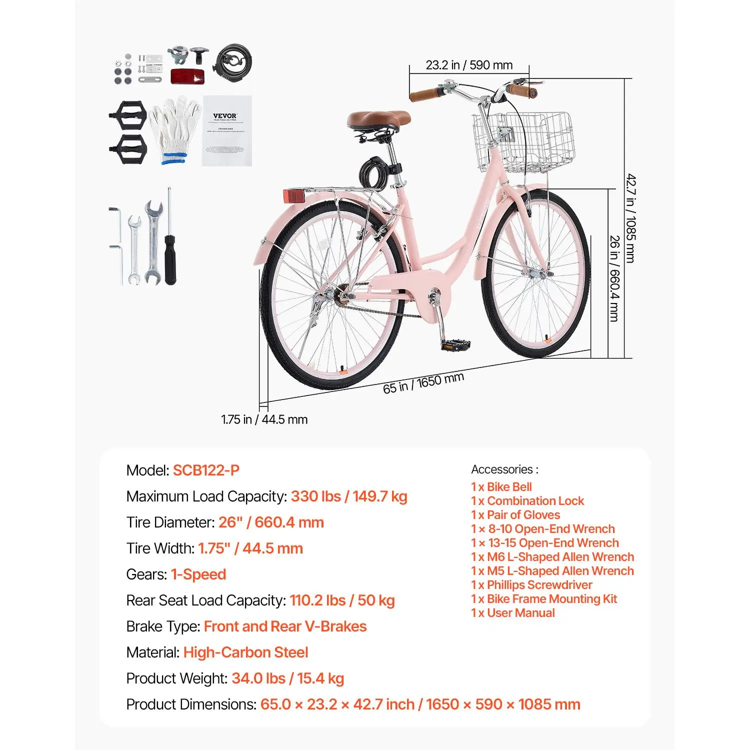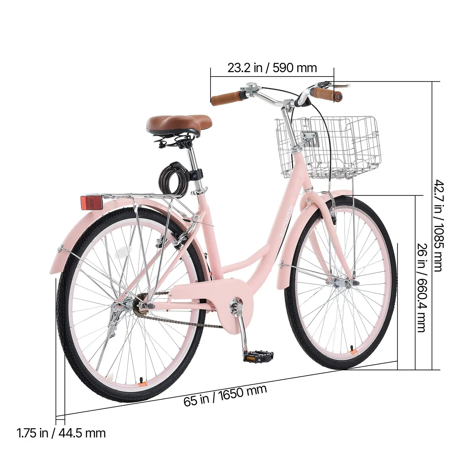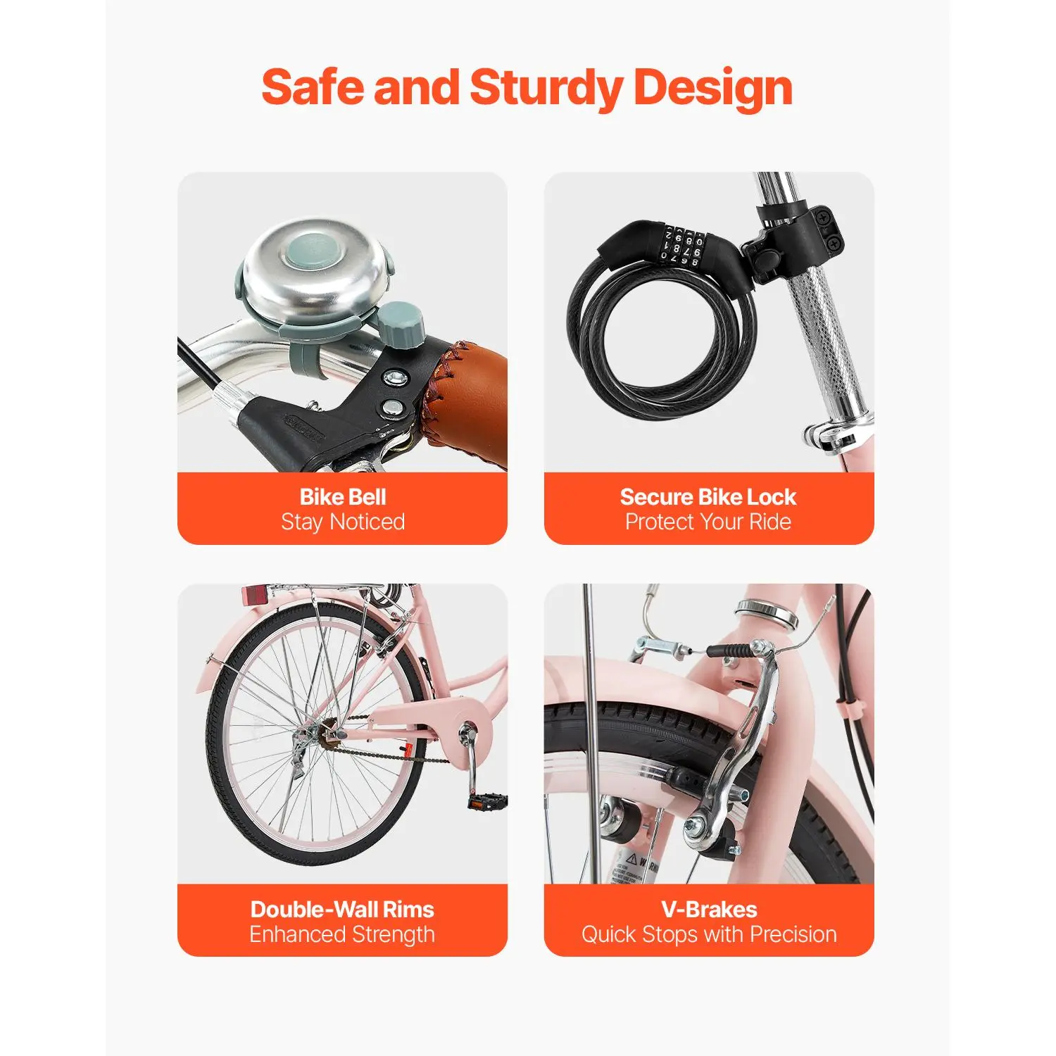 • Durable & Reliable: Constructed with a high-carbon steel frame, this cruiser bike withstands daily wear and impact. Front and rear V-brakes ensure strong stopping power, while double-layered rims enhance durability. Equipped with reflectors, fenders, a bell, and a combination lock for added security and convenience.