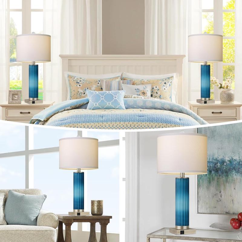 ·Gradient Blue Glass Lamp: The table lamp is a stunning work of art that seamlessly combines modern and coastal styles. Crafted from vertical stripes gradient blue glass lamp body with squar champagne color metal base, paired with the white fabric lampshade which will create a warm atmosphere for any place, provides a finishing touch to your house space. The blue lamps are a great addition to a nightstand bedroom, living room, den, library, study or any area.