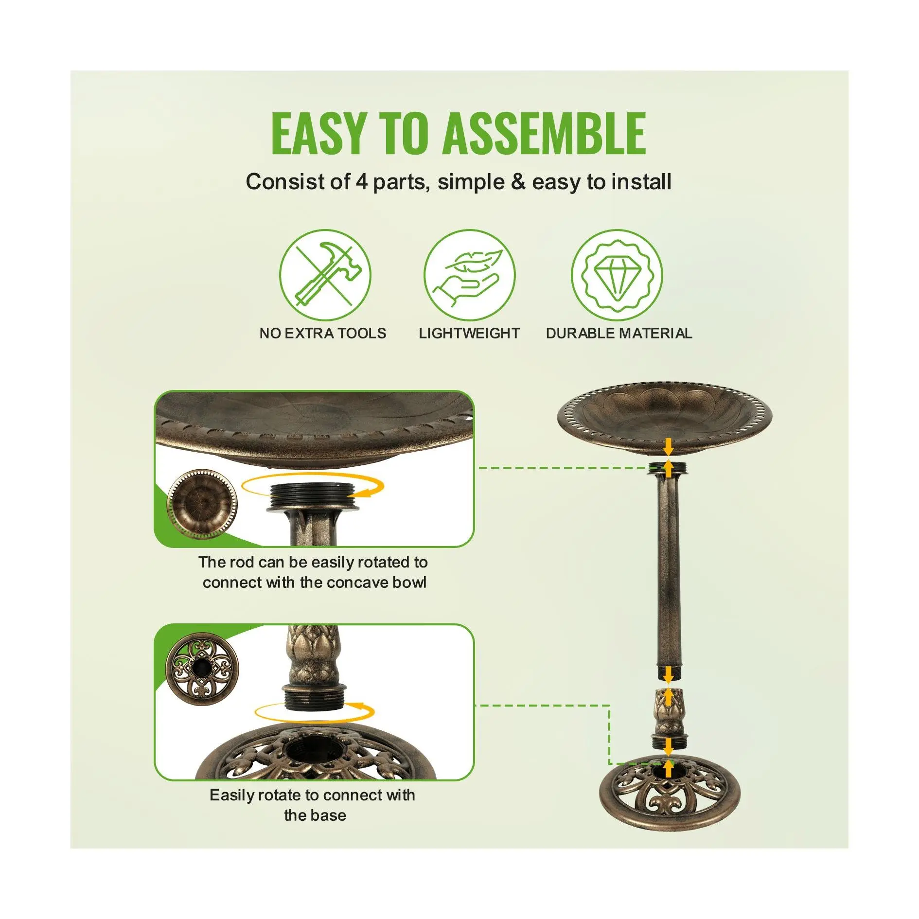 Easy to assemble. I’m thinking I may have to stake it into the ground somehow as the squirrels like to drink from it too and I’m afraid they’ll tip it over. The birds are loving it!