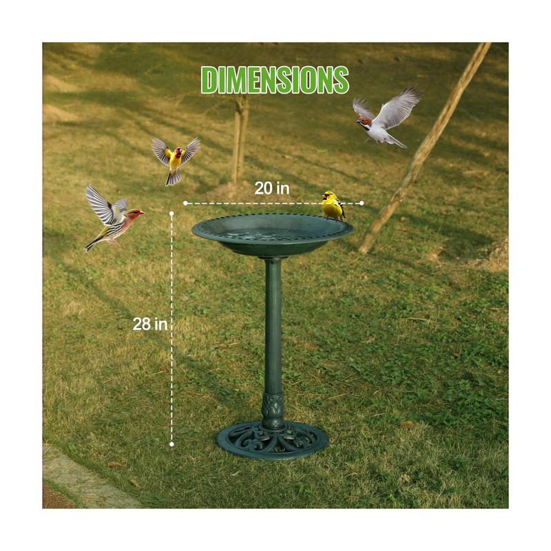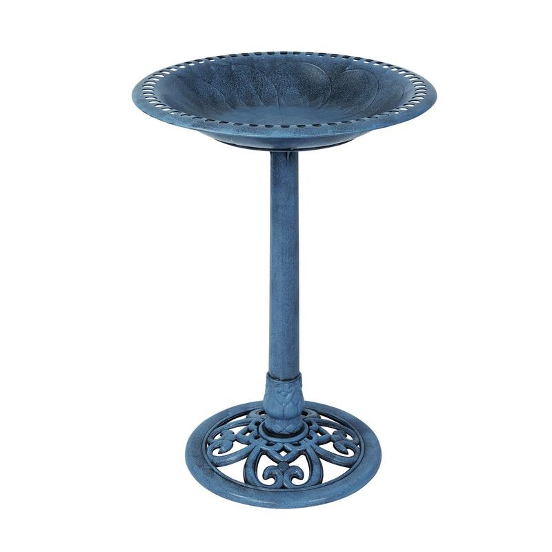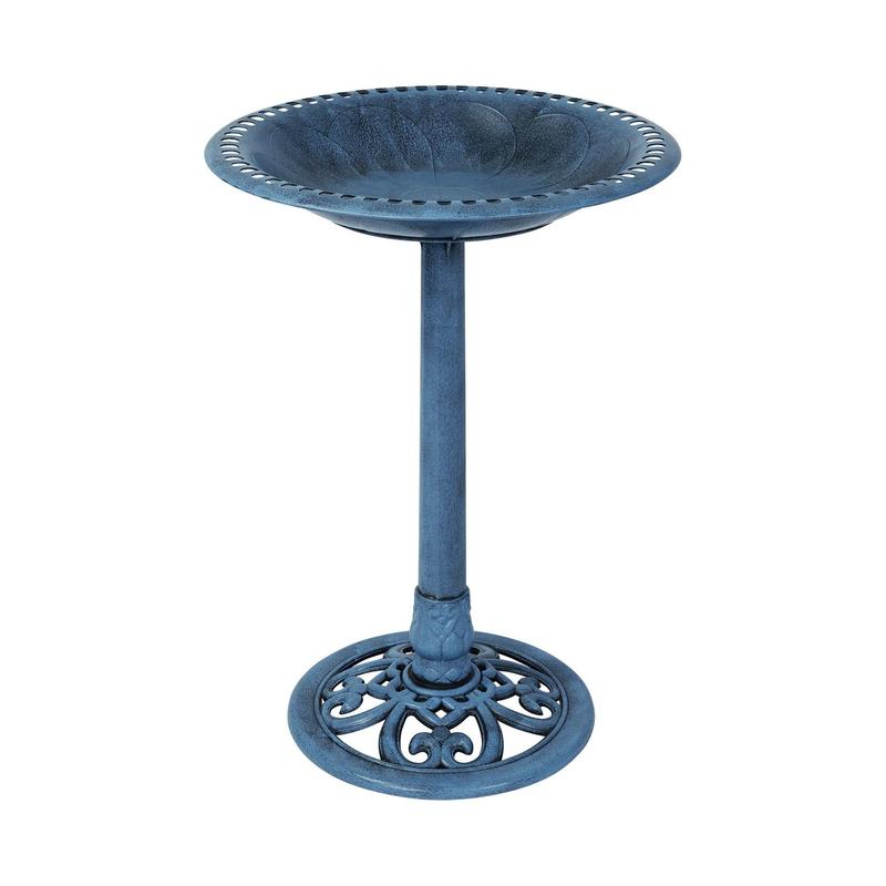 Enhance your garden with this elegant bird bath that combines traditional design with modern durability. The detailed scrollwork on the base adds a touch of charm while providing your feathered visitors a refreshing spot to drink and bathe. With its weather and fade-resistant green finish, this bird bath is an attractive and practical addition to any outdoor space. From Backyard Expressions.