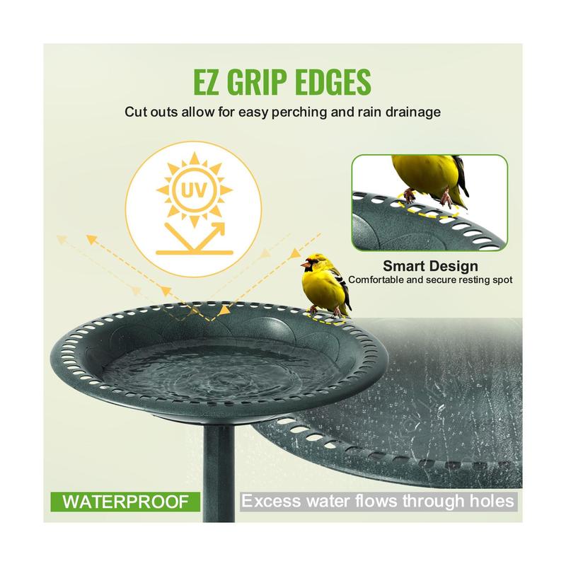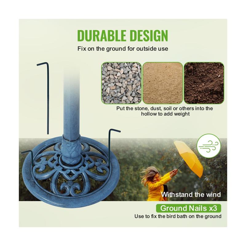 I love this bird bath so much! It’s beautiful and so easy to put together. It has anchors for grass or dirt or it sits nicely on a patio. The birds love it and I enjoy watching them. 🐦 Wonderful purchase!