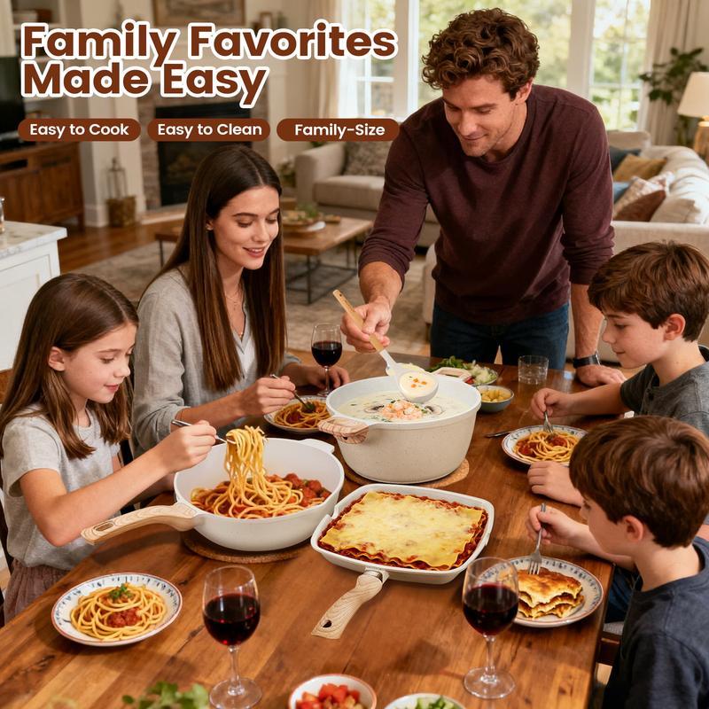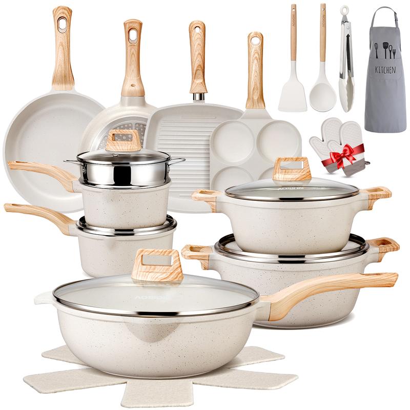This 27PCS set includes pots and pans, perfect for healthy cooking. It comes with gloves, an apron, and silicone tools. The set is oven and dishwasher safe, ensuring convenience. PFOA/PFOS free, it's safe for everyday use. Ivory-colored, it adds a touch of elegance to your kitchen.