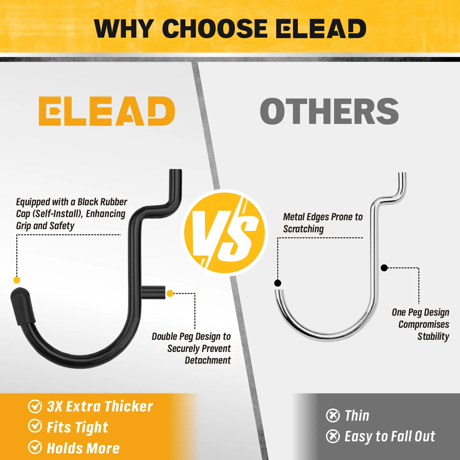·3X EXTRA THICK – Features 3X thicker steel hooks with a powder-coated finish and double stabilizing pegs that support up to 70 lbs maximum per hook, outperforming standard pegboard accessories in durability and load capacity.