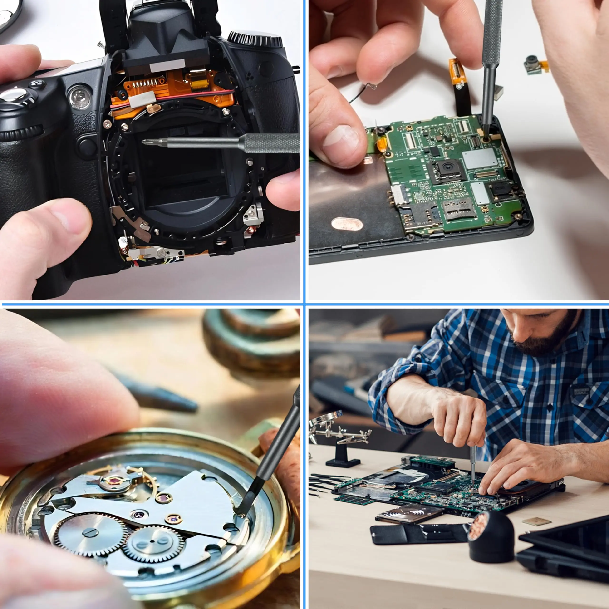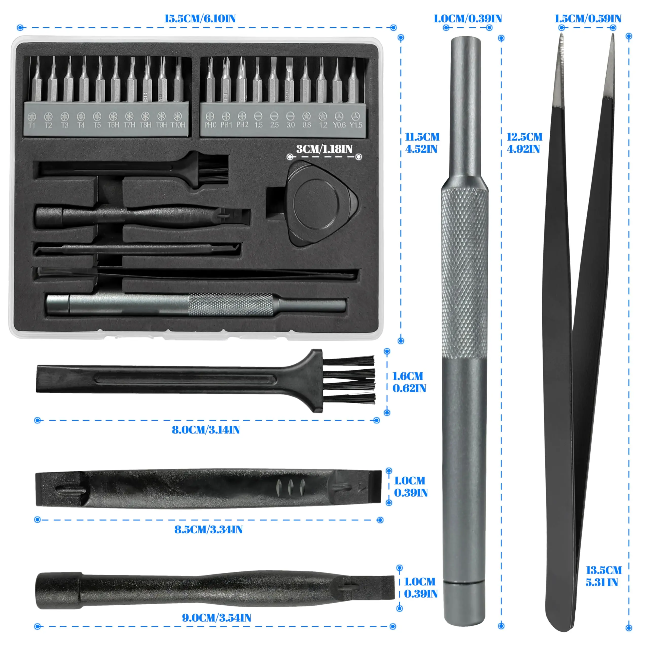 This comprehensive screwdriver set includes 20 CHROME VANADIUM bits and 9 essential tools. It features a stainless steel screwdriver handle, a brush, and precision tweezers. Perfect for laptops, smartphones, gaming consoles, cameras, watches, and glasses. This kit ensures convenience and efficiency in various repair tasks.