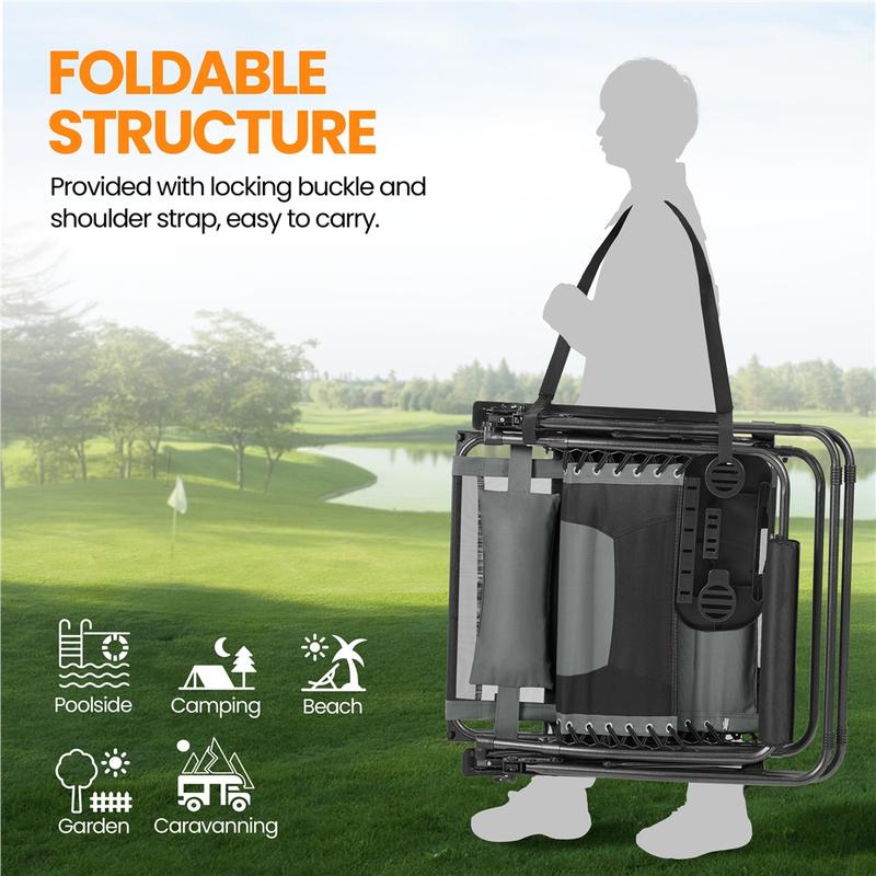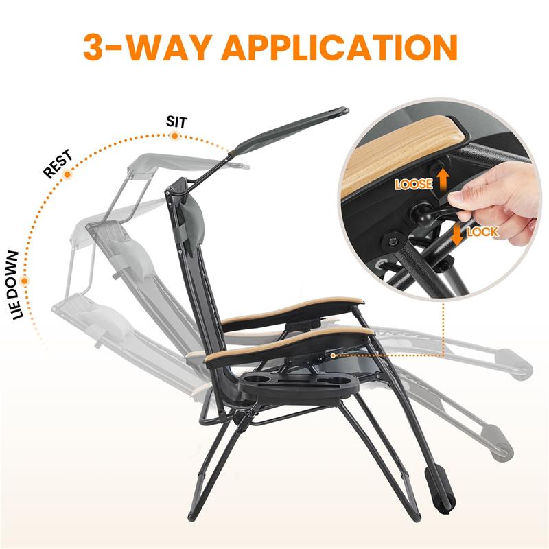 This outdoor recliner is made for hot summer days. It features an adjustable sunshade, breathable mesh back, and smooth beech wood armrests for a cool and comfy experience. The backrest adjusts so you can sit upright or lie down. The strong Oxford fabric with elastic straps gives solid support, and the padded seat and footrest add extra comfort. Built with durable outdoor materials, it holds up to 400 lb. It’s foldable, lightweight, and easy to carry with a buckle and shoulder strap – perfect for camping or relaxing anywhere.