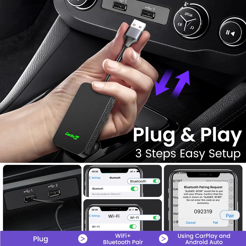 Just simple 3 steps, After the first setup, our adapter will automatically activate the Android Auto or CarPlay wireless connection every time the car starts. Enjoy setup it up once and for all.