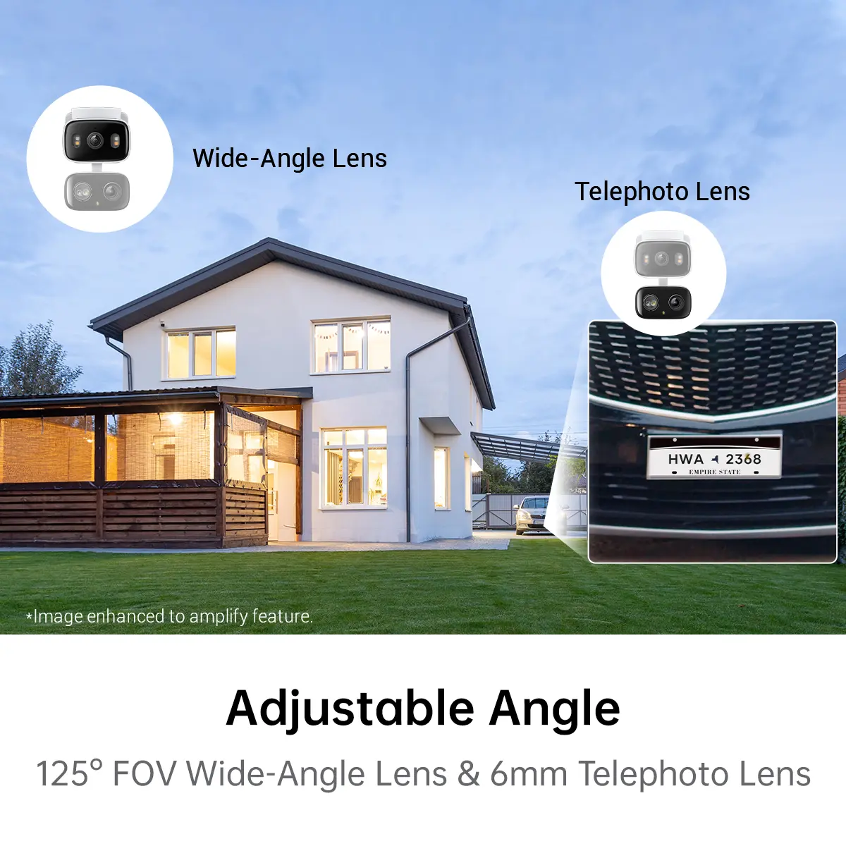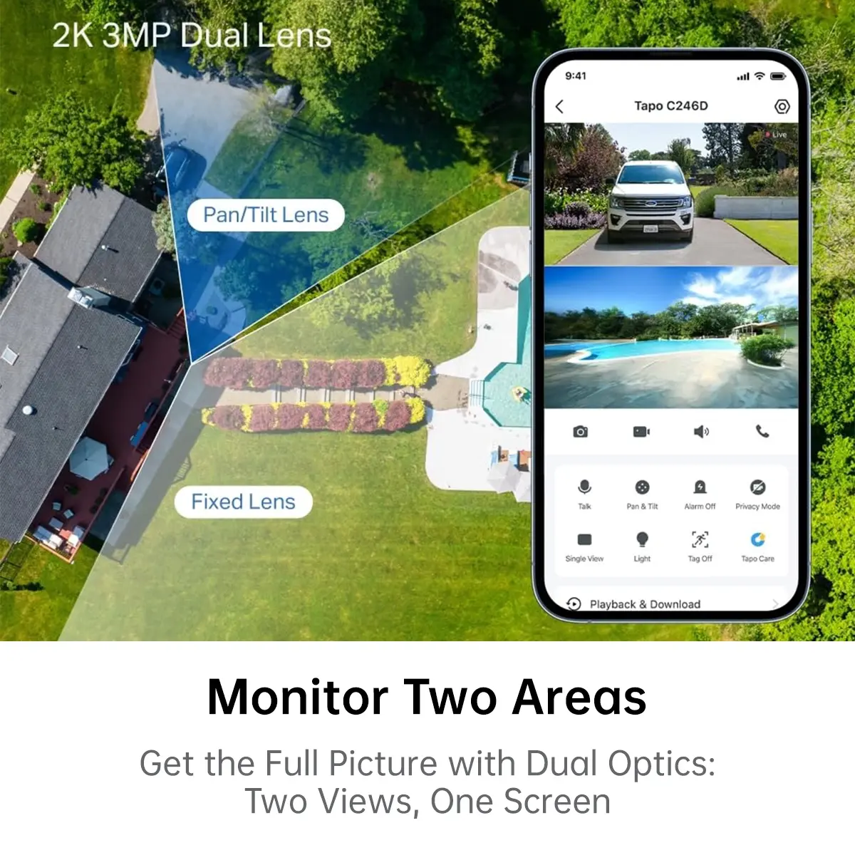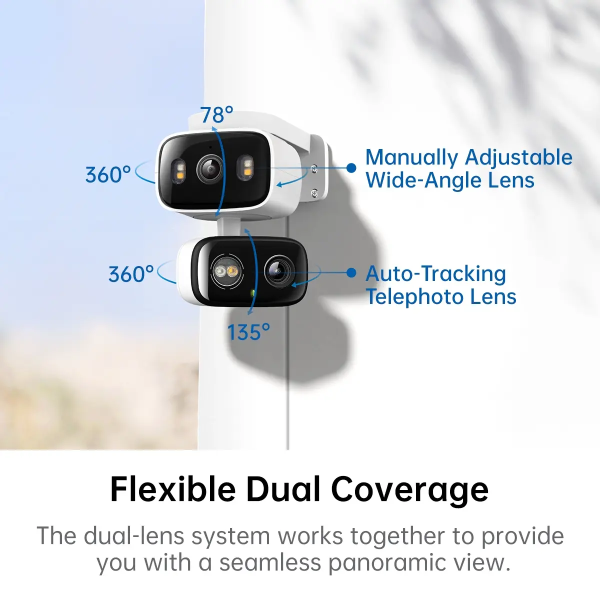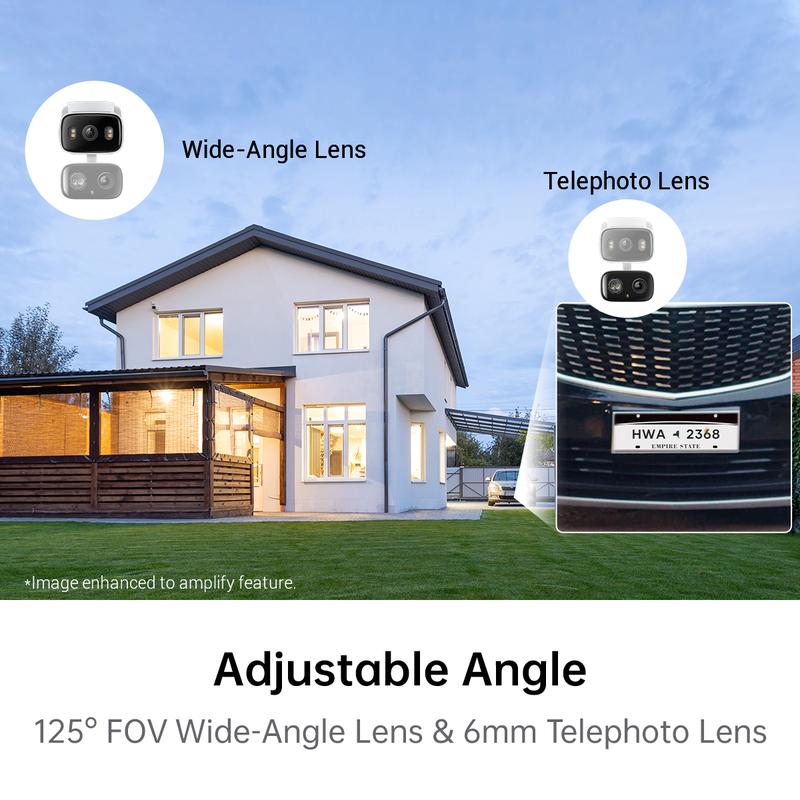 ·2K 3MP Dual Lens: Capture detailed footage with dual 2K high-definition lenses. The fixed lens provides a 130° wide-angle view, while the pan/tilt lens offers 6mm telephoto zoom for sharp, close-up details.