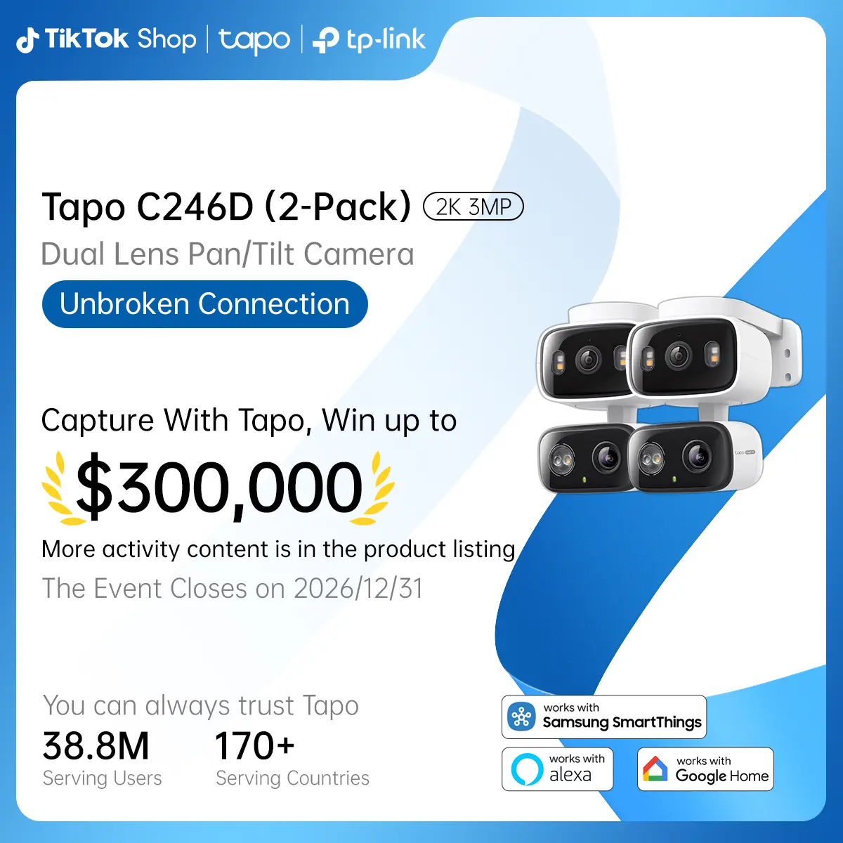 ·Smart Home Integration: Fully compatible with Amazon Alexa, Google Assistant, and Samsung SmartThings, allowing you to control the cameras with simple voice commands.