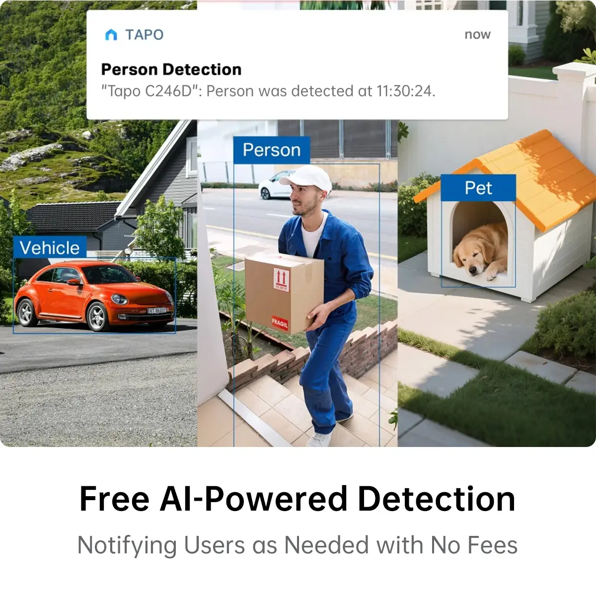 ·Free AI Detection & Notification: Receive accurate alerts for motion, people, pets, vehicles, and even baby cries using built-in AI detection. There are no additional fees for this feature.