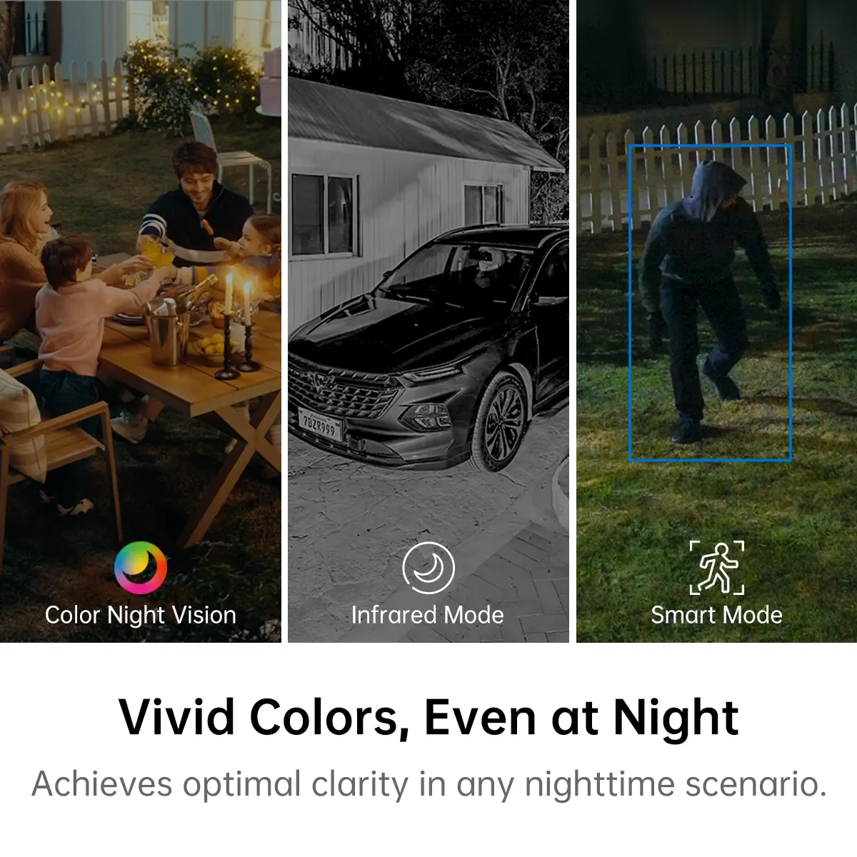 ·Smart Night Vision: Choose from vibrant full-color with spotlights, discreet black-and-white infrared, or an automatic Smart Mode that switches to color when motion is detected, ensuring optimal clarity in any nighttime scenario.