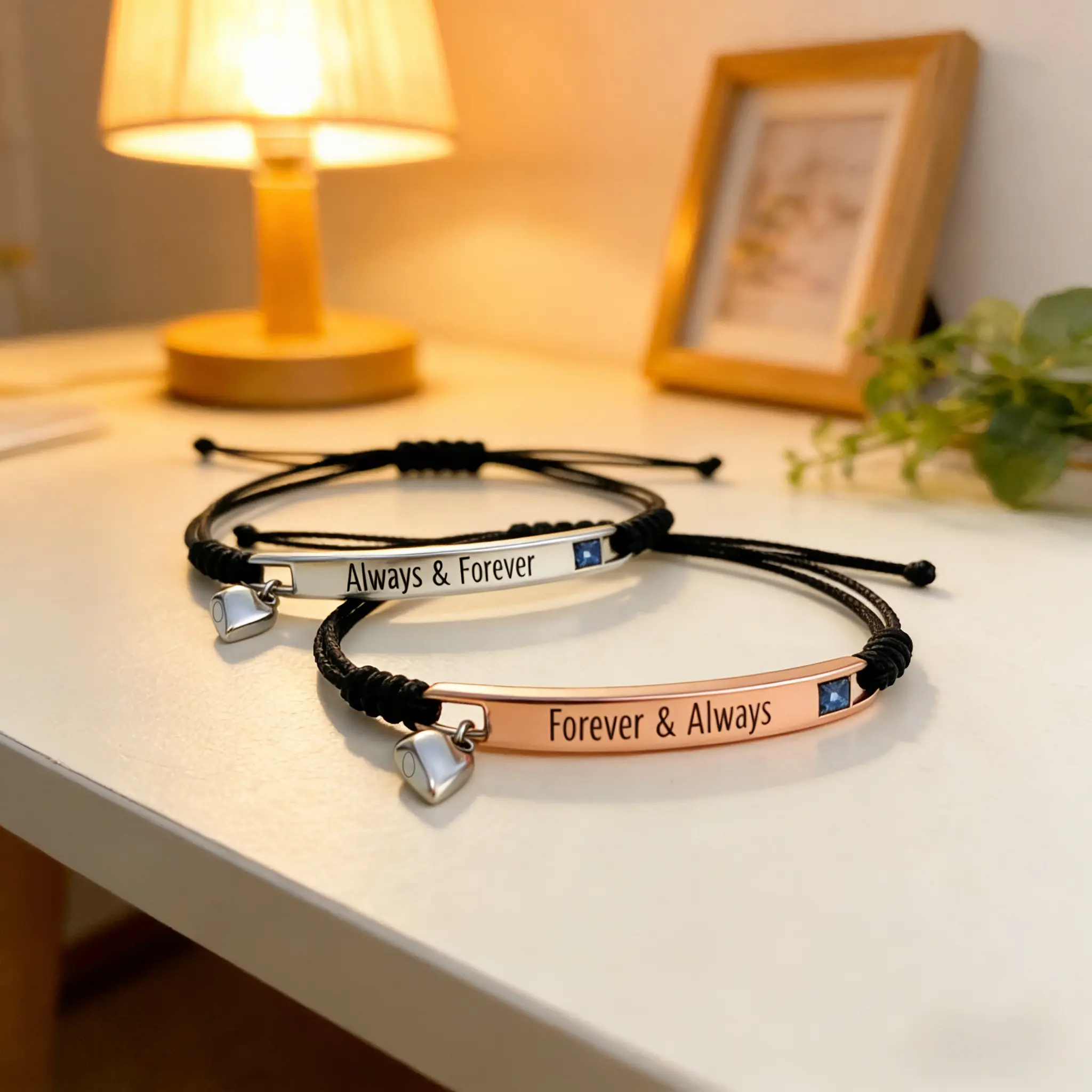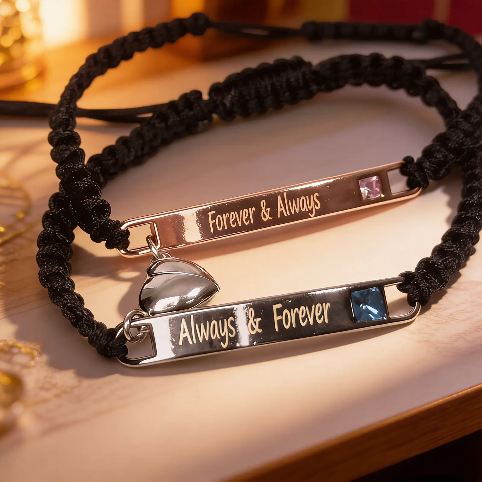 ·His Bracelet (Silver Tone):Engraved with"Always & Forever"+ a deep Blue Crystal.