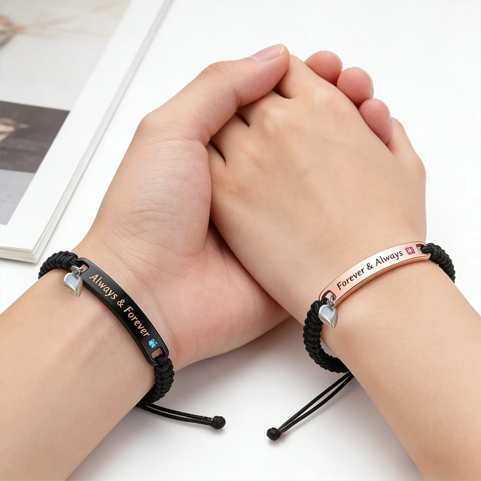 ·Her Bracelet (Rose Gold Tone):Engraved with"Forever & Always"+ a sparkling Pink Crystal.