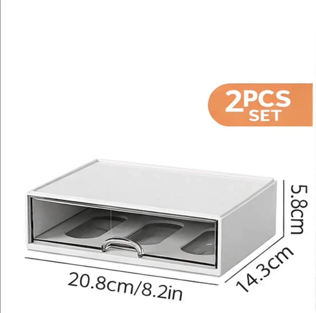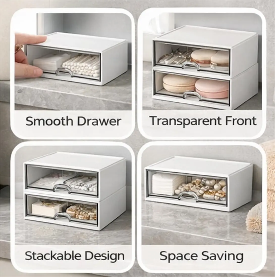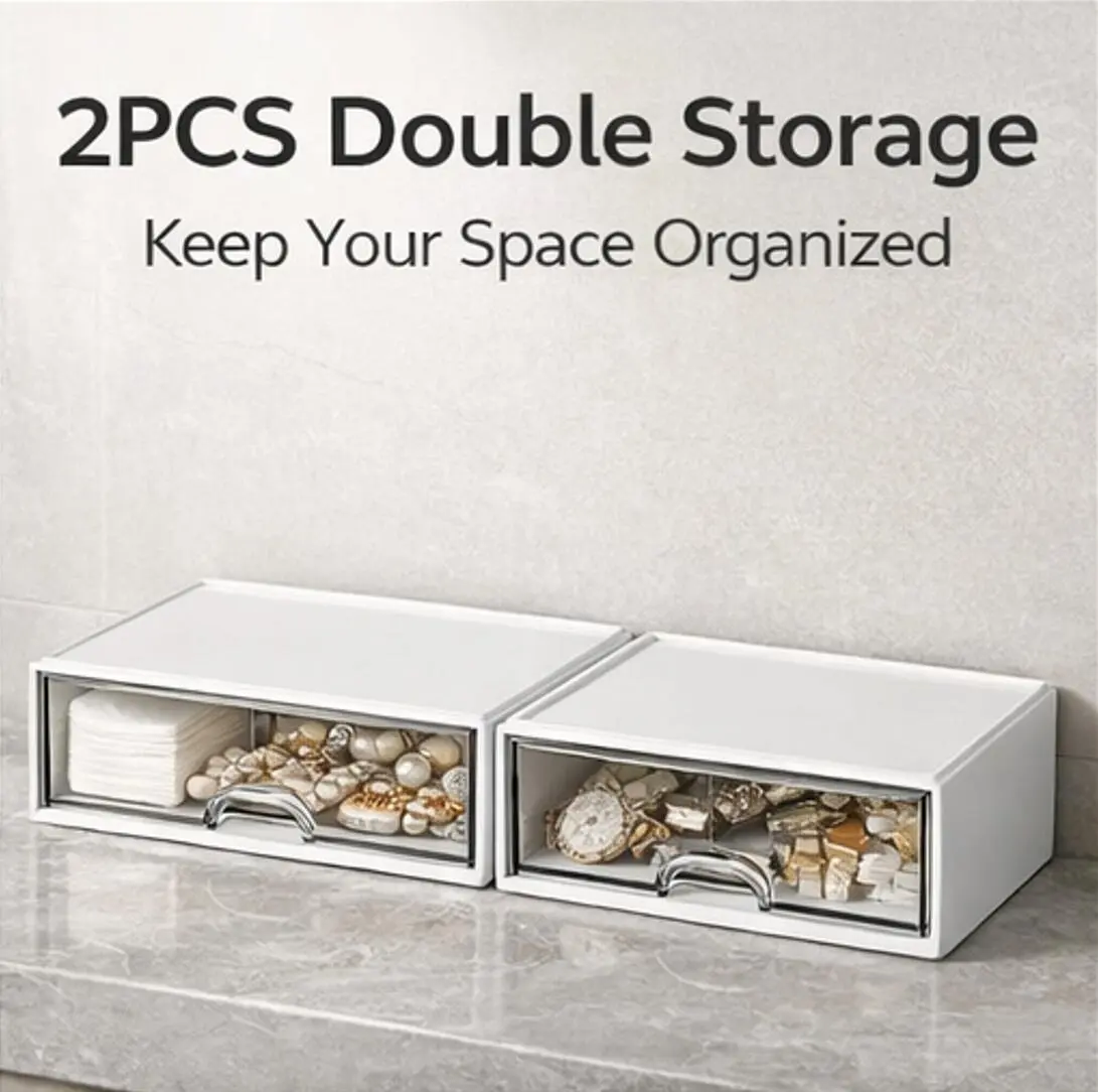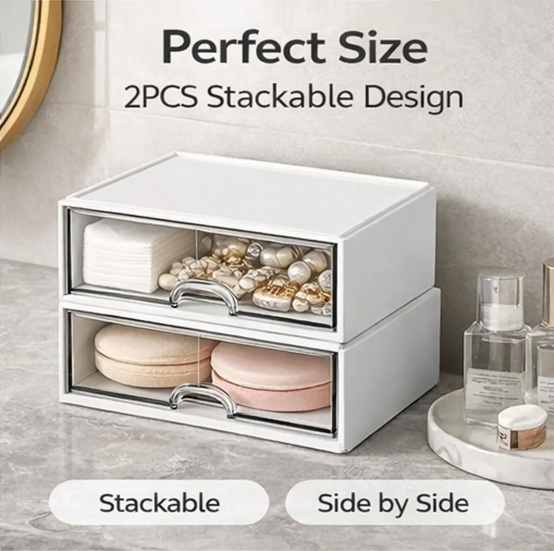 2PCS Drawer Organizer Set – Stackable Storage Box with Clear Front, Space-Saving Desktop Organizer for Makeup, Accessories