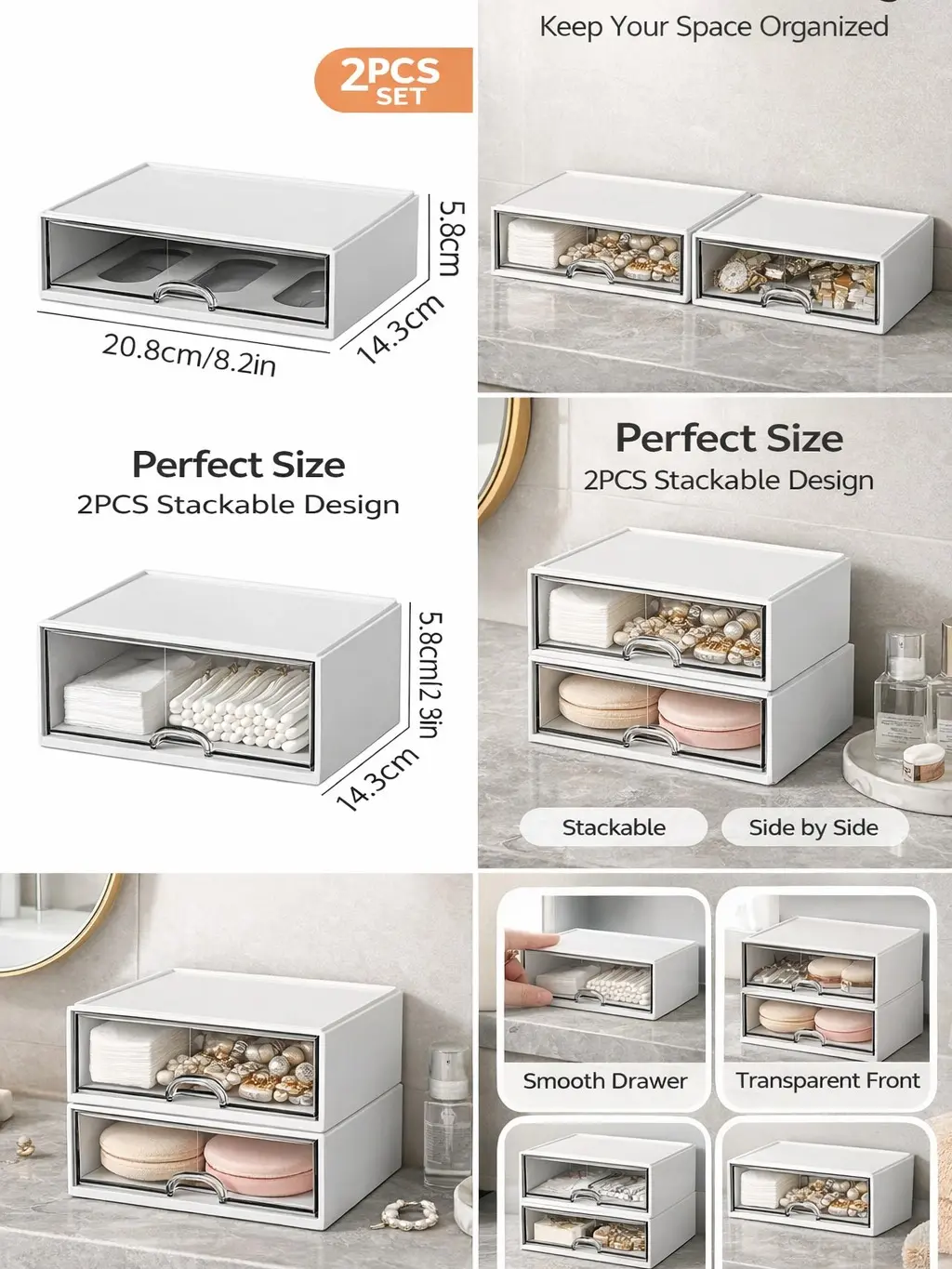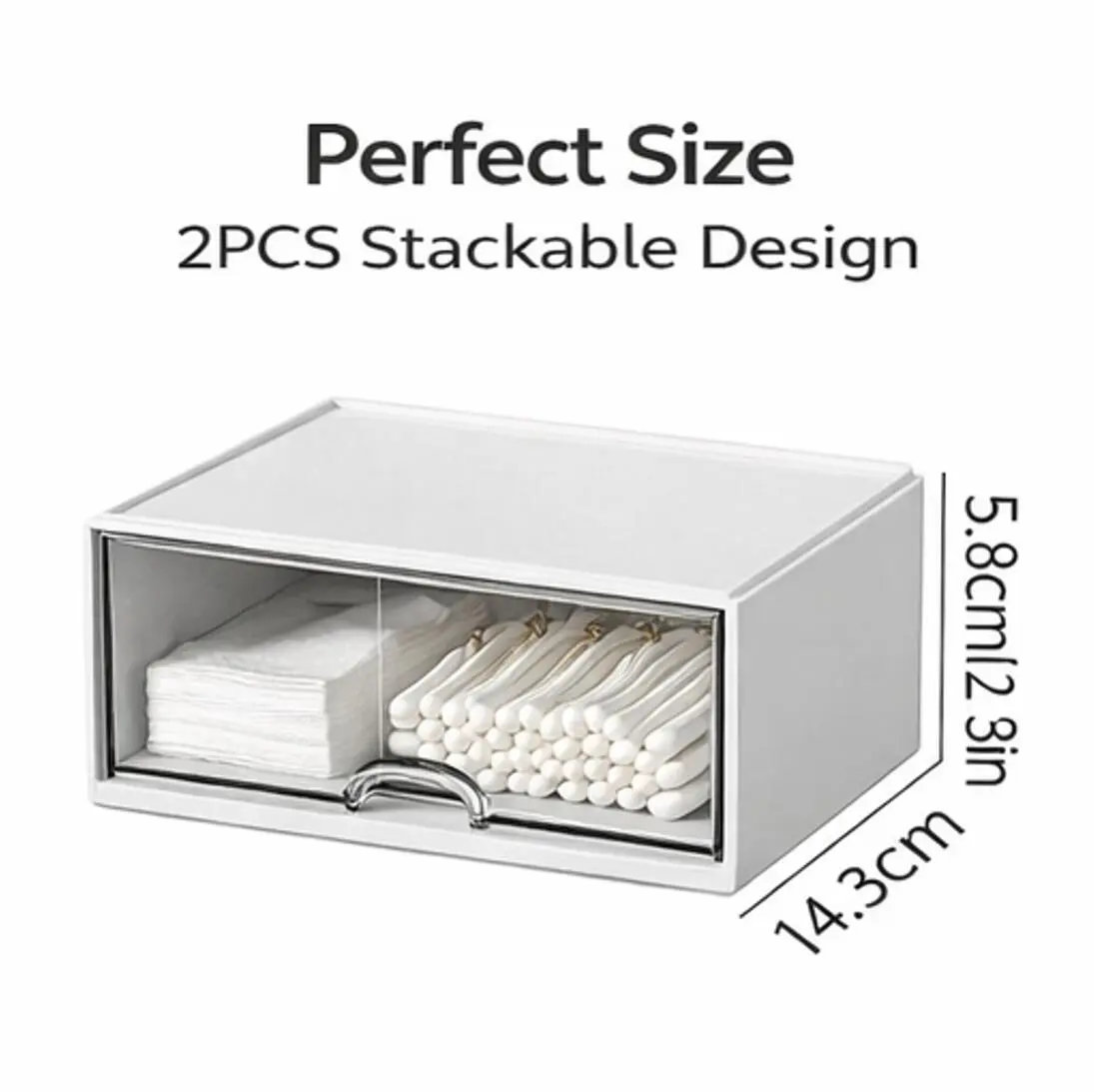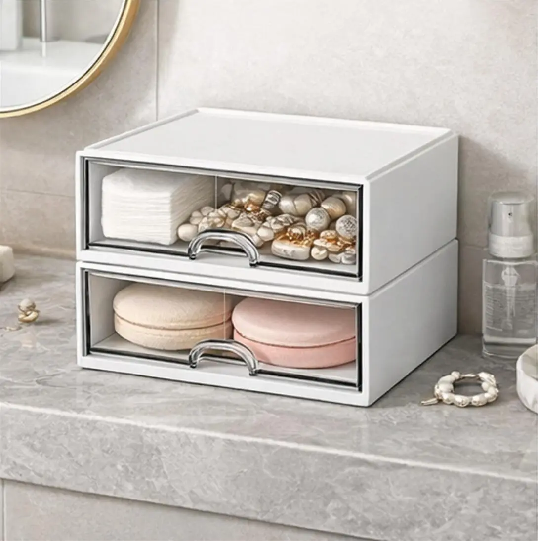 2PCS Drawer Organizer Set – Stackable Storage Box with Clear Front, Space-Saving Desktop Organizer for Makeup, Accessories