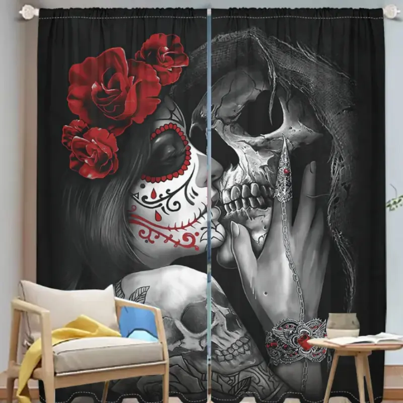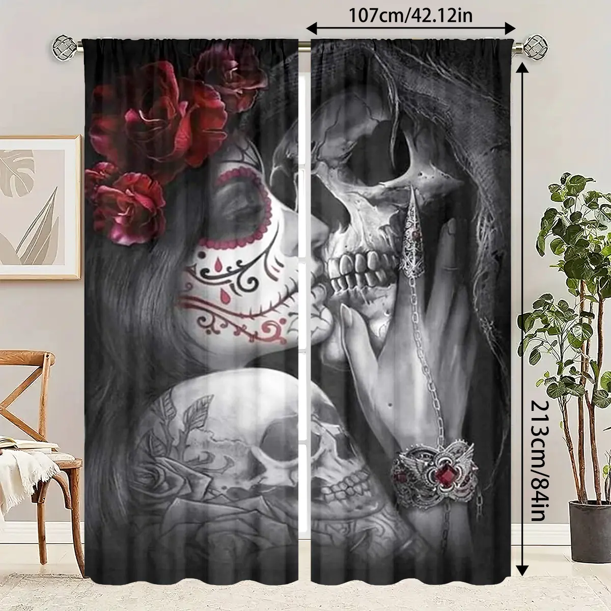 2pcs Gothic Skeleton Skull Curtains, High-Definition Digital Print, Polyester Material, Semi-Transparent, Privacy Protection, Washable, Home Decoration Curtain
